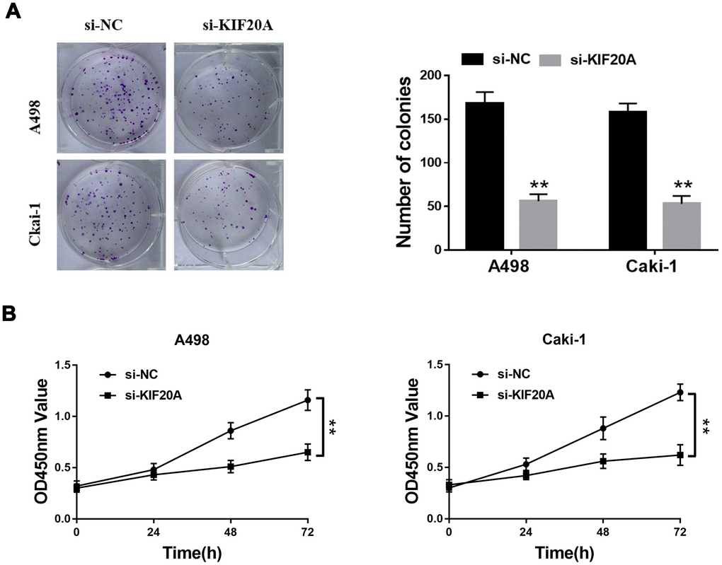 Based on the results of transwell assays, a significant decrease on the content of migrating and invasive cells was detected in the si-KIF20 group (Figure 9A, 9B). This observation was further validated by wound-healing assays, in which a prominent wound healing area with lower migration rate was equally observed in the si-KIF20A group when compared with the control (Figure 9C). Knockdown of KIF20A expression can also significantly decrease the number of colonies based on a clonogenic assay (Figure 10A). Likewise, MTT assay result indicated that KIF20A knockdown is able to inhibit the proliferation of renal cancer cells (Figure 10B).