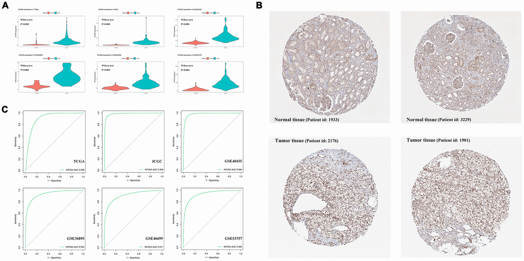 Upon merging the scaled matrix of KIF20A expression from both TCGA and GTEx databases, we observed that KIF20 was highly expressed in a variety of cancer types, including KIRC (Figure 1). Increased levels of KIF20A expression were also observed in renal cancer, according to TCGA, ICGC and GSE (GSE40435, GSE36895, GSE46699 and GSE53757) databases (P<0.001) (Figure 2A). Representative immunohistochemical images illustrating KIF20A protein levels (obtained from the HPA database) are shown in Figure 2B. These results indicate some stronger staining intensity and quantity along the tumor tissue (Patient id: 1933, Cells in glomeruli: Staining = high, Intensity = strong, Quantity > 75%, Cells in tubules: Staining = high, Intensity = strong, Quantity = 25%-75%; Patient id: 3229, Cells in glomeruli: Staining = medium, Intensity = moderate, Quantity > 75%, Cells in tubules: Staining = medium, Intensity = moderate, Quantity > 75%; Patient id: 2176: Staining = high, Intensity = strong, Quantity > 75%; Patient id: 1901: Staining = high, Intensity = strong, Quantity > 75%). The ROC curve revealed that KIF20 had a compelling sensitivity and specificity to predict the occurrence of ccRCC (Figure 2C).