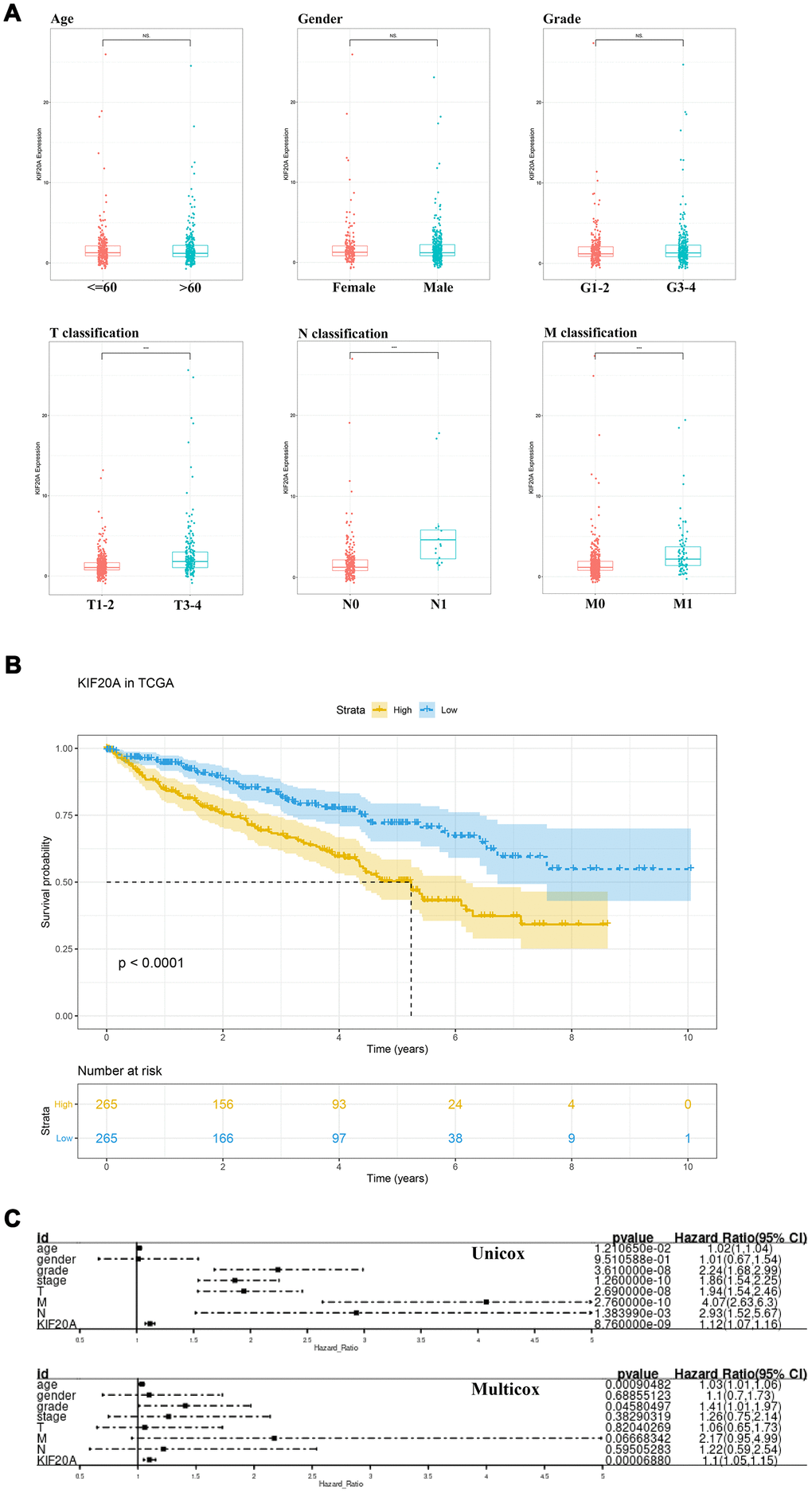 The respective patient information, as deposited in the TCGA database, is shown in Supplementary Table 1. The association between each subset of clinical information and KIF20A levels was analyzed by R software according to the Wilcox test. We found that the levels of KIF20A expression continuously increased stepwise in each subgroup of T, N and M classification, suggesting that KIF20A may play a role in promoting a malignant phenotype (Figure 3A). The survival analysis revealed a shorter overall survival (OS) in patients with high KIF20 expression when compared to those with low KIF20 expression (P<0.0001) (Figure 3B). Results from single- and multi-factor analyses indicated that the negative effect of KIF20A towards patient survival was independent of other clinical features (Unicox, KIF20A, HR = 1.12, 95% Cl = 1.07-1.16, P < 0.001; Multicox, HR = 1.1, 95% Cl = 1.05-1.15, P < 0.001).