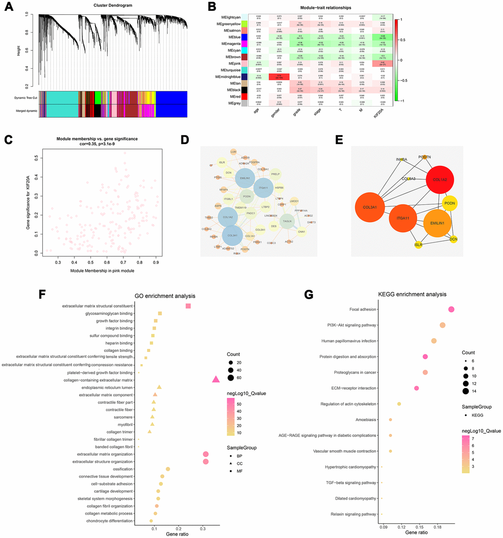 WGCNA analysis was conducted to identify gene modules associated with KIF20A expression in ccRCC. A total of 539 samples derived from ccRCC patients were clustered according to average linkage method and Pearson correlation analysis. Next, a network topology analysis of various soft-thresholding powers was performed to have relatively balanced scale independence and average connectivity of WGCNA. To make sure we developed a scale-free network, a power of β= 6 (scale-free R2) was selected as soft-thresholding parameter. After merging modules with dissimilarity of less than 25%, 14 distinct gene modules were identified (Figures 4A, 4B). Correlation analysis was further performed between the MEs of each gene module and KIF20A. Subsequently, a pink module (Cor = 0.42, P = 2e-27) was identified according to its high correlation with KIF20A expression (Figure 4C). Thereafter, a PPI network was constructed based on the genes present in the pink module. In this case, the top ten nodes were COL1A2, COL3A1, ITGA11, EMILIN1, PODN, DCN, ISLR, POSTN, COL6A3 and INHBA (Figure 4D, 4E).