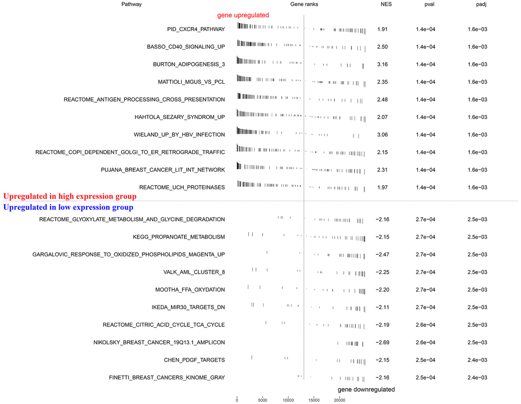 To explore how the KIF20A gene was involved in ccRCC progression, we performed a GSEA based on the TCGA-derived ccRCC cohort. As shown in Figure 5, features including high expression phenotype, signaling pathways related to CXCR4 cascade, CD40 signaling-up, and burton adipogenesis were enriched (FDR < 0.25 and NOM P-value < 0.05).