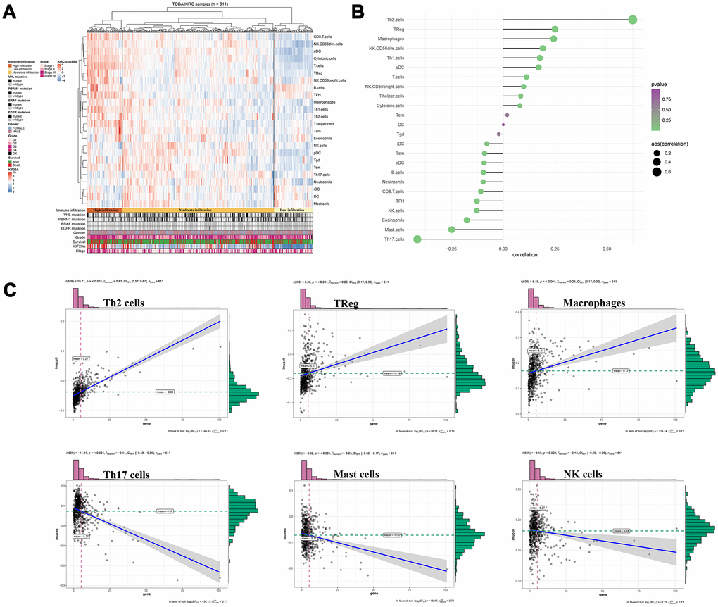 Considering the interconnection between KIF20A and the immune system, we further evaluated the effect of KIF20A in immune cell infiltration [14, 15]. Our results revealed that KIF20A is correlated with high immune infiltration of ccRCC tumor microenvironment. In this case, KIF20A was able to remarkably increase the numbers of Th2 cells, macrophages, and Tregs in the tumors, in contrast to the decrease on the numbers of Th17 cells, mast cells and NK cell. Based on a report from Senbabaoglu and colleagues, which explored the effects of tumor-infiltrating immune cells on disease prognosis, the increase of Th17 cells and CD8+ T/Treg ratio were both associated with improved survival in two cohorts [23]. Besides, Roumenina and colleagues have found that ccRCC cells may hijack macrophage-produced complement C1q, thereby promoting tumor growth [24]. The accumulation of NK cells in ccRCC microenvironment has also been considered associated with enhanced patient survival [25]. According to the retrospective analysis of 662 non-metastatic ccRCC samples, Fu and colleagues have suggested that patients with high mast cell infiltration might have a better OS, cancer-specific survival (CSS) and relapse-free survival (RFS) [26]. The evidence mentioned above may explain the poor prognosis of high KIF20A patients from the perspective of tumor immune microenvironment. These results indicate that KIF20A potentially have a reference value for the relief and immunotherapy in patients affected by ccRCC.