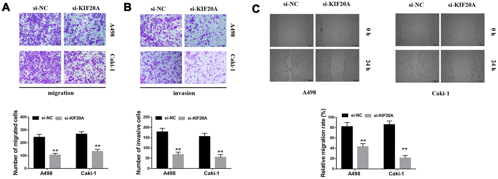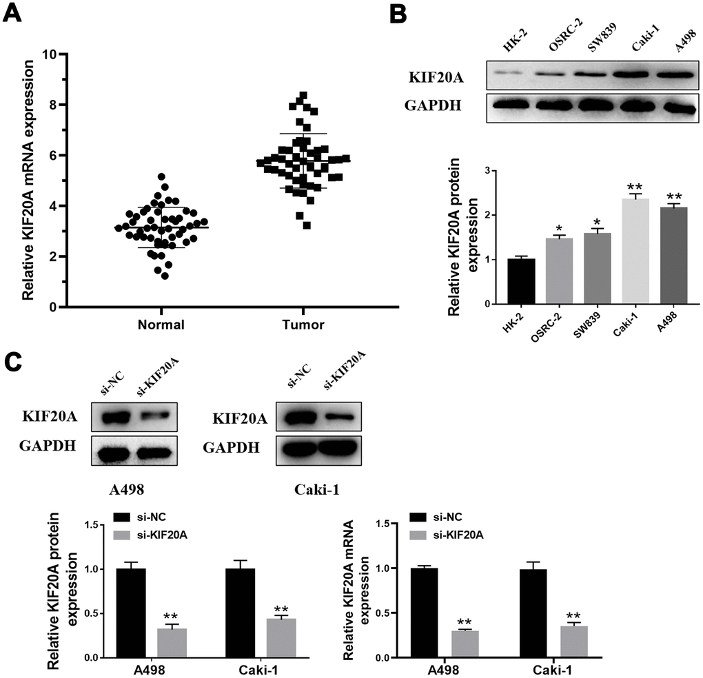 The knockdown of KIF20A expression in vitro was performed using small interfering RNAs (siRNA). For this, Caki-1 and A498 cells were transfected with control or KIF20A-specific siRNAs using Lipofectamine 3000 (Invitrogen). The target sequences used for siRNA against KIF20A were sense: 5-GGCCAGGUUUCUGCCAAAATT-3, antisense: 5-UU UUGGCAGAAACCUGGCCTT-3. Western blotting and qPCR were used to evaluate the efficiency of small RNA interference.