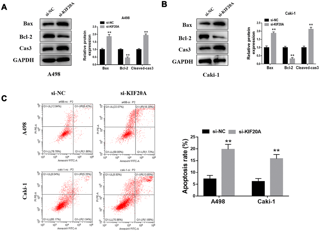 Western blotting analysis showed that KIF20A knockdown may significantly increase the protein level of Bax and cleaved-Cas3 and, contrarily, decrease Bcl-2 protein level (Figure 8A, 8B). Furthermore, flow cytometry results manifested a higher apoptosis rate in the si-KIF20A group when compared to control cells (Figure 8C).