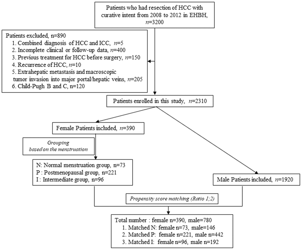 From 2008 to 2012, a total of 3200 patients who had been diagnosed with HCC and had undergone surgical resection as the primary treatment in Eastern Hepatobiliary Surgery Hospital, Second Military Medical University, were screened and enrolled in our analysis. The early diagnosis of HCC was based on typical imaging features on dynamic CT and/or MRI and the level of AFP in accordance with current guidelines, and was further confirmed by postoperative pathological diagnosis. We identified 390 female and 780 male HCC patients who met the inclusion criteria: (1) a clear and definite record of menstruation at the time of surgery and during the follow-up for female patients, (2) Child-Pugh score A, (3) no previous treatment for HCC before surgery, (4) radical hepatectomy (R0), (5) HCC the only diagnosis of malignancy, (6) no extrahepatic metastasis and macroscopic tumor invasion into the major portal/hepatic veins and bile duct (Figure 1). A female patient who had had regular menstruation until the end of the follow-up was assigned to the normal menstruation group (N) while a patient who had had menopause before surgery was assigned to the postmenopausal group (P). The remaining patients whose menopause occurred during the follow-up were included in the intermediate group (I) (Figure 1).