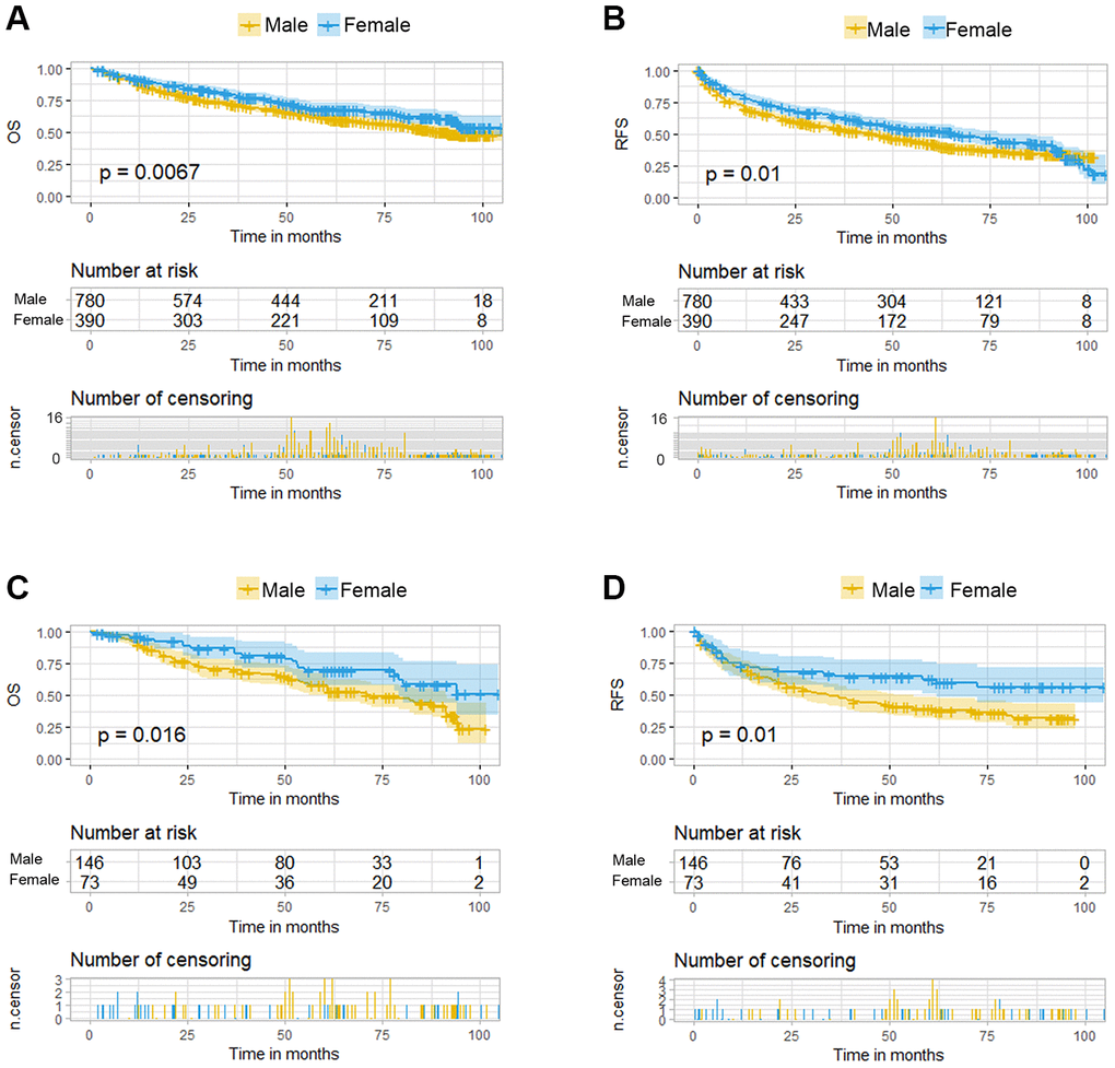 In conclusion, the nomograms in our study depicted the OS and RFS more accurately than the present predictive guidelines. Based on propensity score matching, we performed balanced subgroup analyses in three female subgroups defined by menstruation status and their matched male counterparts to achieve precise prediction and provide evidence for the usefulness of menopause hormone therapy (MHT) for postmenopausal women. It might also support more frequent follow-ups in male patients matched with females in the normal menstruation group for early diagnosis and treatment.