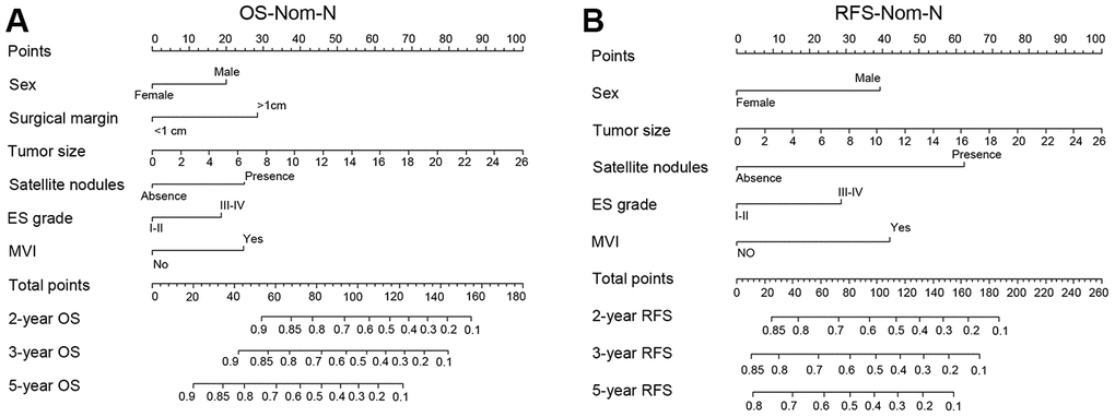 Basing on our new nomogram for RFS, the 2-year RFS prediction for a 35-year-old female with low HBV titration, two-centimeter diameter tumor, no satellite nodules and MVI, no cirrhosis and ES grade I is higher than 0.85 while the 2-year RFS for a male patient in the same condition was below 0.8. However, in RFS-Nom-T, the predicted probability of recurrence for these two patients are all around 0.85. The nomogram is a simple, visual, and commonly used method for probability prediction. The BCLC staging system is the most common clinical staging system for HCC patients for evaluating their condition, treatment decisions, and prognosis prediction. However, our nomograms exhibited higher net benefit in both C-index and DCA curves for both OS and RFS, which may guide follow-up frequency.