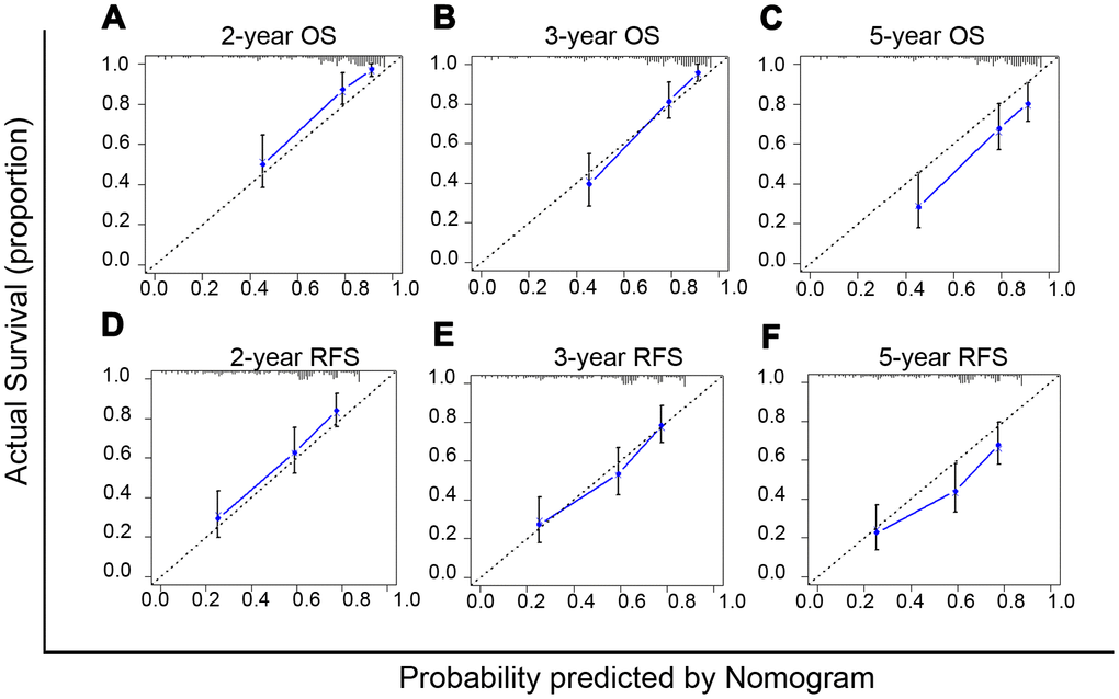 The nomogram model can predict outcomes and provide a risk evaluation for each patient based on screened independent risk factors. This has been shown to be more accurate in predicting prognosis than other conventional staging systems. In the N group matched with men, the above independent factors for OS and RFS were integrated into nomogram models (OS nomogram of matched N group named OS-Nom-N, RFS nomogram of matched N group named RFS-Nom-N), respectively (Figure 3A, 3B). The C-index and calibration curve were used to evaluate the consistency between the predictions based on the nomogram models and the actual value. The models performed well for predicting OS and RFS. The C-index of OS-Nom-N and RFS-Nom-N models were 0.773 (95%CI, 0.726-0.820) for OS and 0.724 (95%, 0.676-0.771) for RFS (Table 3). The calibration curves (2-, 3-, or 5-year) showed a reasonable uniformity between the prediction by nomogram models (OS-Nom-N and RFS-Nom-N) and the actual observation (Figure 4A–4F).