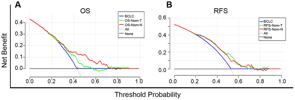 Comparison of our nomograms with the BCLC staging system illustrated that Nom-N was more powerful than Nom-T and BCLC for OS and RFS prediction in terms of the C-index. The net clinical benefit of OS-Nom-N was evident in DCA where the threshold probability ranged between 40% and 70% while obvious superiority was seen in both RFS-Nom-N and RFS-Nom-T when compared to BCLC.