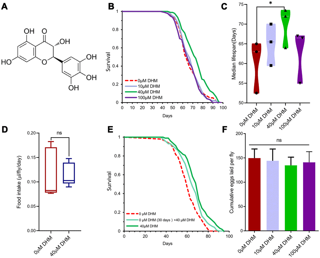 Dihydromyricetin (2R, 3R)-3, 5, 7-trihydroxy-2- (3, 4, 5-trihydroxyphenyl)-2, 3-dihydrochromen-4-one (PubChem CID: 161557 and ChEBI: 28429) is a flavanonol, one of the subgroup of flavonoids (Figure 1A). Lifespan is an important indicator of the aging process. We firstly examined the effects of Drosophila lifespan by adding DHM to diet at concentrations of 0μM, 10μM, 40μM, and 100μM. The result showed that 40μM DHM can extend median lifespan by 16.07% (from 63 days to 72 days), and maximum lifespan of female flies on SYA fully fed (FF) media (Figure 1B, 1C and Supplementary Figure 1A, Supplementary Table 1A). In addition, we also tested whether DHM can extend lifespan in dietary restriction (DR) conditions. When 40μM of DHM was added into DR and FF yeast food media, it did extend the lifespans on both diets (Supplementary Figure 1B). In the following experiments, it is assumed that we chose 40 μM on FF media as the optimal working concentration for the subsequent experiments unless otherwise stated.