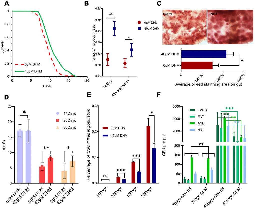 The Triacylglyceride (TAG) level was increased in DHM-treated flies. Even after 48 hours of starvation, DHM-treated flies maintain a high TAG level (Figure 2B). We also used the Oil Red O staining to mark the stored lipid in the gut. Fly guts with DHM treatment show expansion in the oil-red staining area after 14 days (Figure 2C), demonstrating that DHM can increase the lipid store levels in Drosophila. DHM also significantly slowed down the climbing ability declining during aging (Figure 2D). Overall, the addition of DHM can improve the fly’s general health during its lifespan.