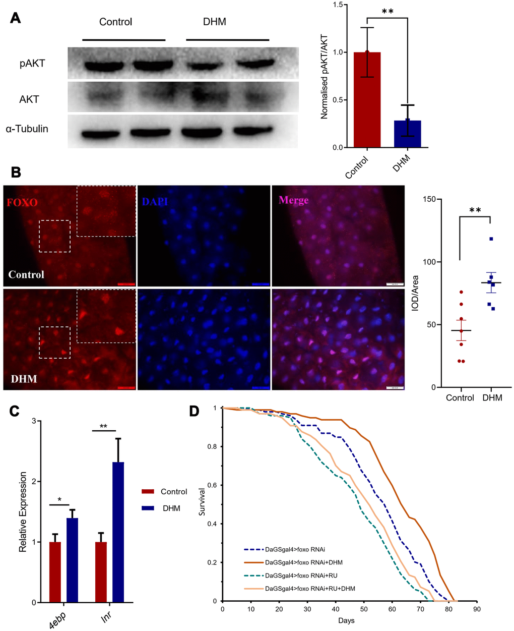 Furthermore, we hope to reveal how DHM regulates healthspan and longevity. Previously, it was reported DHM can downregulate AKT signaling in vitro [29, 30]. AKT is the effector of IIS signaling and can suppress FOXO target expression [31]. Therefore, we checked the phosphorylation level of AKT after treatment with DHM. The result showed that pAKT level did reduce in DHM-treated flies (Figure 3A), indicating that DHM represses AKT signaling in the adult fly. As pAKT can phosphorylate FOXO, and holding it in the cytoplasm, therefore, we checked the FOXO protein in the nucleus of adult gut cells with antibody. We found that the DHM treatment can promote the localization of FOXO in the nucleus (Figure 3B). We also found that consistent with the two target genes of FOXO, Inr and 4ebp were up expressed in the DHM-treated flies compared to the control group (Figure 3C). This demonstrated that DHM can enhance the activity of the transcription factor FOXO.
