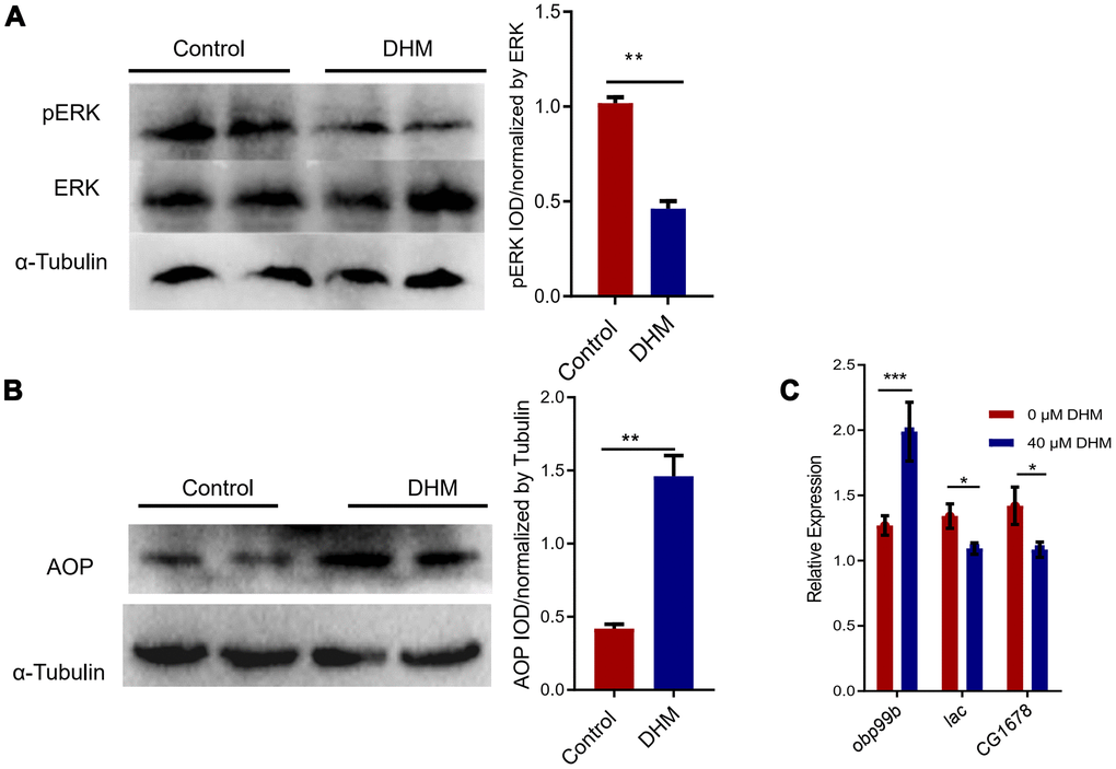 Inhibition of RAS-ERK signaling pathway was observed after DHM treatment [32]. Also inhibition of ERK signal activity was considered to be an effective anti-aging strategy [15, 33]. As we showed that knockdown of the foxo just partly blocked the lifespan extension effect of DHM, we then examined whether DHM affects ERK signaling in the process of regulation in aging. We confirmed that the DHM-treated flies significantly decreased the phosphorylation level of ERK by Western blots (Figure 4A). As we know that inhibition of RAS activity promotes the nuclear localization of Anterior open (AOP) in the adult fat body [15]. Therefore, we investigated if there would be AOP expression change after DHM treatment. Our results have shown that DHM led to a significant increase of AOP protein level in the adult fly (Figure 4B). To further assess the transcriptional activity of aop upon treatment with DHM, we also identified the activity of AOP targets. The gene obp99b was thought to be activated by AOP [34] and genes CG1678 and lac were repressed by AOP [15]. Our qPCR results demonstrated that the expression of obp99b significantly increased and the expression of CG1678 and lac significantly decreased in the DHM-treated flies (Figure 4C). These results indicated that DHM modulated the activity of AOP and repressed pERK to enhance health and longevity.