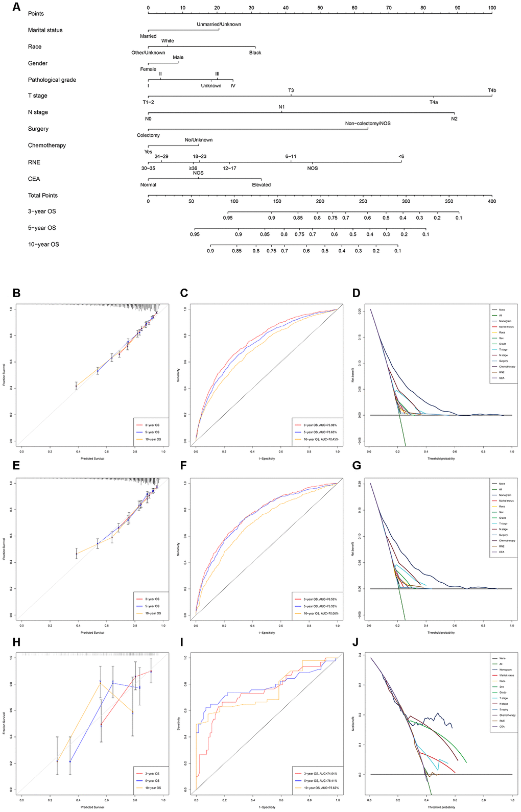 The nomogram predicting OS and CSS for EOLACC displayed that T stage contributed the most to prognosis, followed by N stage, RNE and surgery (Figures 1A and 2A). Various methods were then performed to identify the discriminating superiority of the nomogram. The C-indexes of the nomogram for the prediction of OS were 0.723 (95%CI, 0.711-0.735), 0.730 (95%CI, 0.714-0.747) and 0.716 (95%CI, 0.644-0.789) in the training, verification and external verification group, respectively (Table 5). The calibration curves showed no obvious deviations from the reference line, which displayed an optimal agreement between actual observations and model prediction for 3-, 5-, 10-year OS (Figure 1B, 1E and 1H). The 3-, 5-, and 10-year AUC values of the nomogram for OS were 75.98%, 73.63%, 70.45% in the training cohort (Figure 1C); 76.53%, 75.33%, 70.06% in the verification cohort (Figure 1F); and 74.74%, 78.41%, 75.62% in the external verification group (Figure 1I), which revealed an excellent sensitivity and specificity for the predictive model. Moreover, DCA demonstrated the excellent clinical utility of the comprehensive nomogram, which possessed superior net benefits to the single independent predictor (Figure 1D, 1G and 1J).