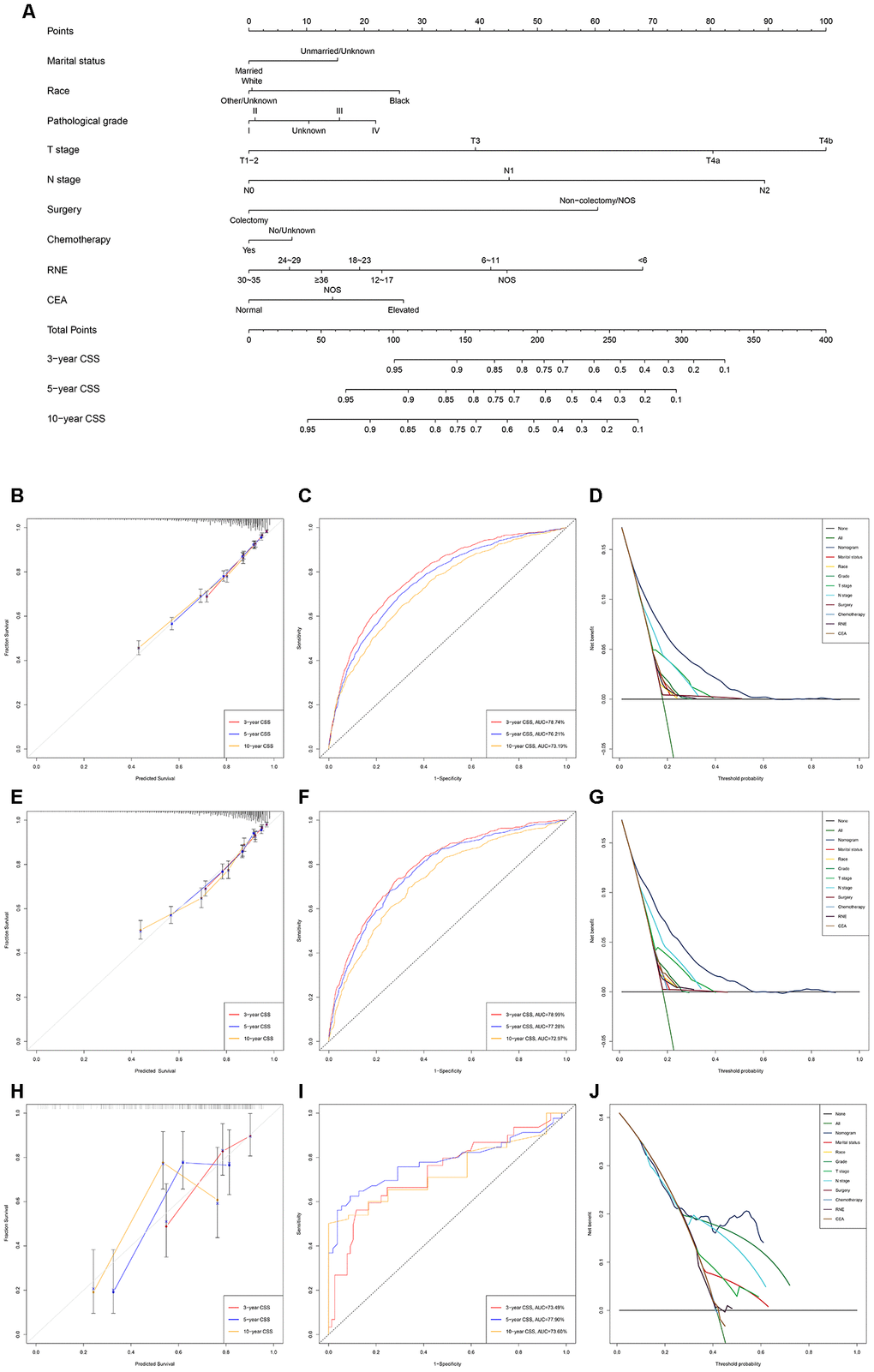 The discriminating superiority of the nomogram predicting CSS also performed well (C-index: 0.751, 95%CI 0.738-0.764 in the training group; 0.755, 95%CI 0.738-0.773 in the verification group; 0.712, 95%CI 0.638-0.785 in the external verification group. The 3-, 5-, and 10-year AUC values: 78.74%, 76.21%, 73.19% in the training group; 78.99%, 77.28%, 72.97% in the verification group; 73.49%, 77.90%, 73.60% in the external verification group) (Figure 2).