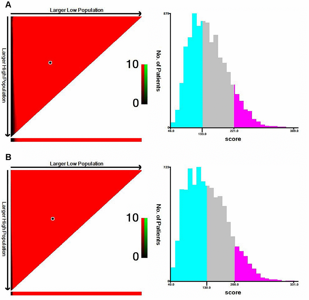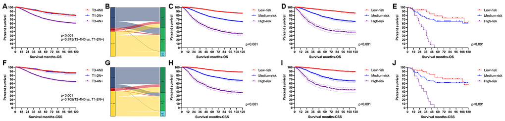 X-tile software was utilized to classify patients as high-risk, medium-risk, and low-risk, according to the risk scores of the nomograms. The cut-off values were 133 and 221 for OS (Figure 3A), 130 and 200 for CSS (Figure 3B). The survival curves in the survival paradox of the AJCC staging system for colon cancer display that patients with T3-4N0 had a similar survival to those with T1-2N+ (OS: p=0.975, Figure 4A; CSS: p=0.709, Figure 4F). Figure 4B and 4G show the correspondence between AJCC stage and the risk stratification in this study.