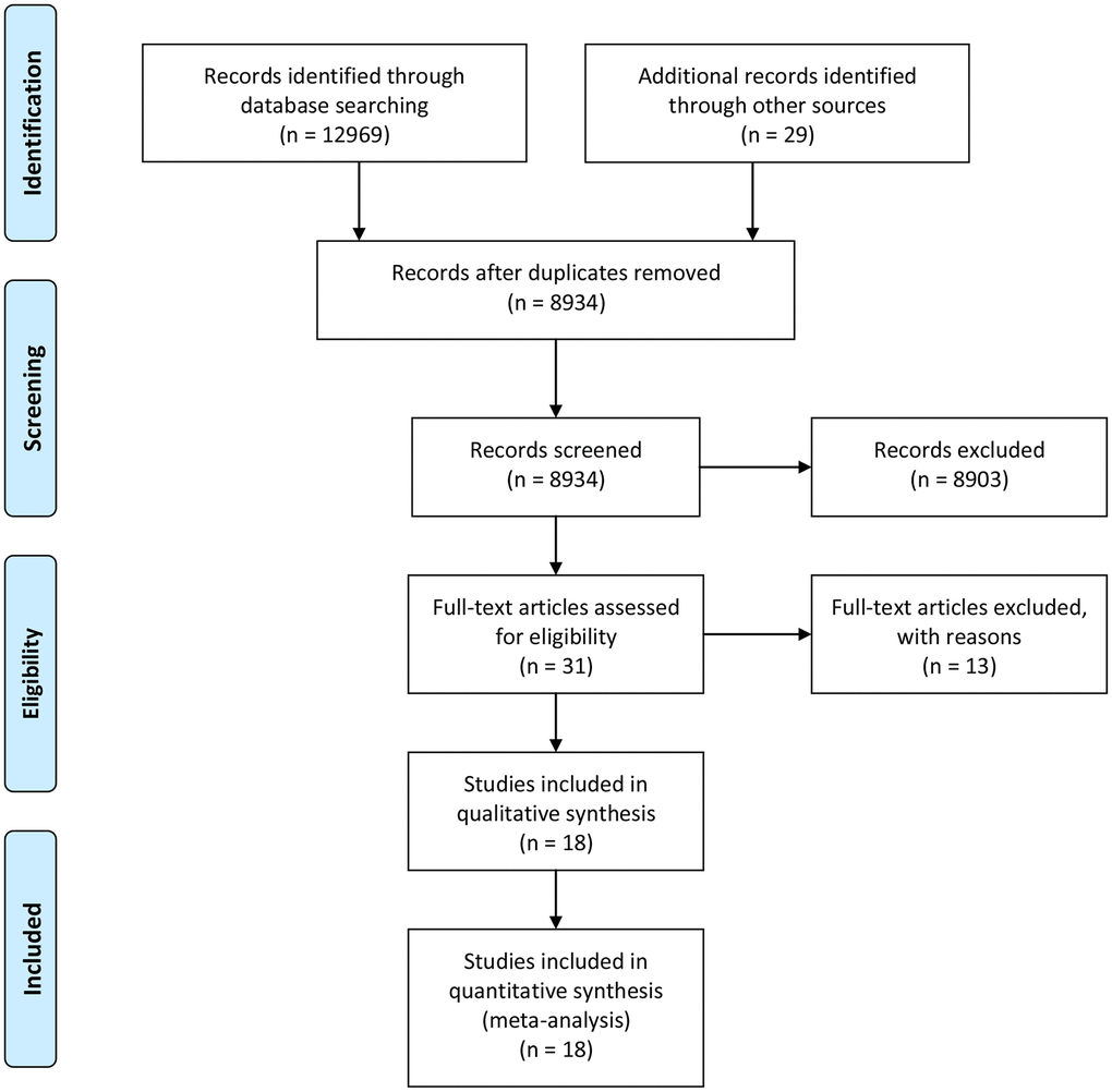 The literature search retrieved 12998 records: 7822 from PubMed, 5147 from Embase, and 29 from other sources (Figure 1). After removing the duplication and unrelated records, 18 records (21 studies) were included into the meta-analysis [15–32] (Supplementary Table 1). Finally, we included a total of 2923 MetS cases and 14062 controls. The Ehala-Aleksejev et al. study investigated the male partners of fertile and infertile couples respectively, while the Natah et al. study and the Olszanecka et al. study focused on the premenopausal and postmenopausal women respectively. Thus, these studies were internally divided into two individual studies. Moreover, 13 studies focused on male cohort, 8 on female cohort, 5 on infertile cohort, 4 on postmenopausal female cohort, and 2 on PCOS cohort. None of the studies were prospective designed. Ten studies were conducted in Europe, 8 in Asia and 3 in Africa. In the assessment of methodological quality, the included studies reached a mean NOS score of 6.58.