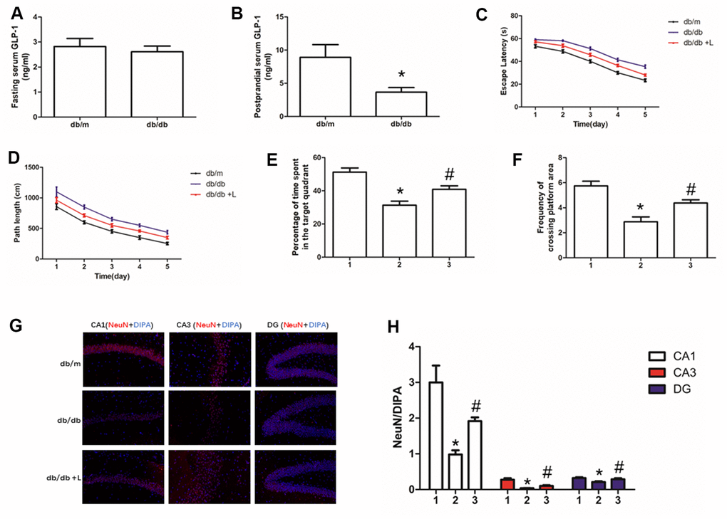 As lower GLP-1 were measured in diabetic mice, liraglutide, a small molecular GLP-1RA, that could cross BBB and cannot be inactivated by DPP-4 was used to remedy diabetic cognition dysfunction. Interestingly, fewer time of escape latency, as well as shorter path length, percentage of time spend in platform area and frequency of crossing platform area of mice with liraglutide treatment were monitored. Neurons loss is an important sign of cognition dysfunction, in the animal experiment, less neurons were detected by immunofluorescence. Additionally, compared to db/db mice without liraglutide, we measured increased neurons in the hippocampus (including CA1, CA3 and DG regions) of db/db mice with liraglutide.