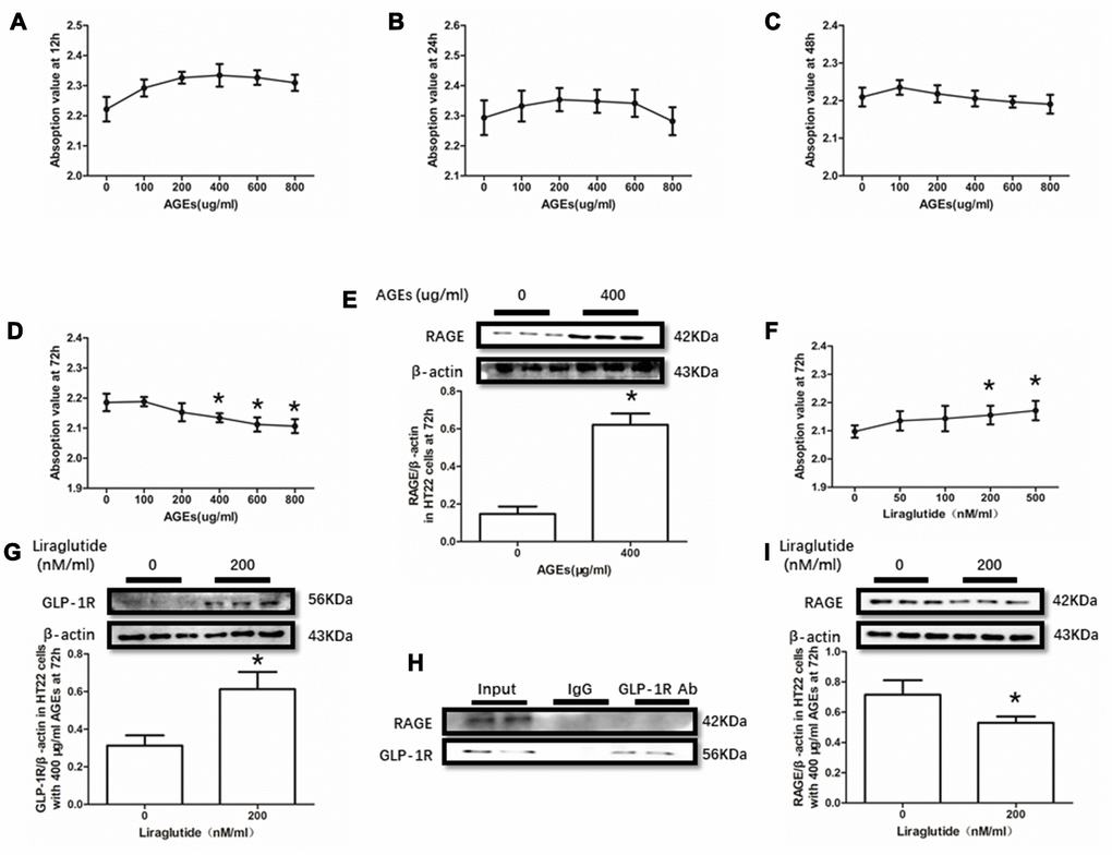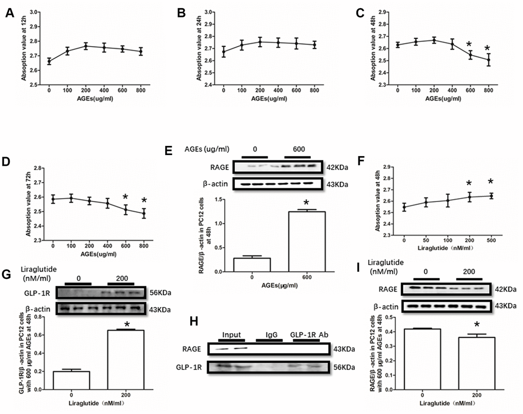 As GLP-1R and RAGE are proteins insert in the cell membrane, we conducted a co-immunoprecipitation assay to investigate the direct interaction between GLP-1R and RAGE. However, we did observe RAGE in the mixture pulled-down by GLP-1R antibody both in PC12 cells and HT22 cells (Figures 3H, 4H).