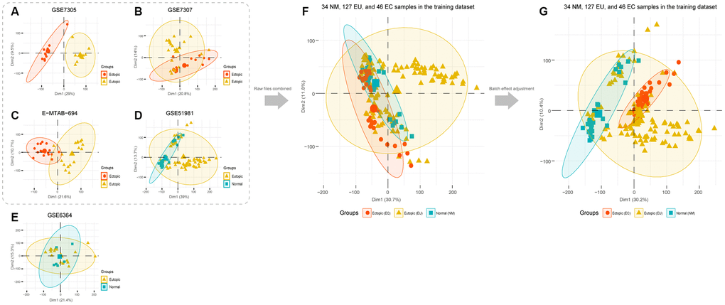 Thus, we processed and merged raw CEL files for GSE7305, GSE7307, GSE51981, and E-MTAB-694. Then, we obtained a normalized matrix, that featured 34 normal (NM), 127 eutopic (EU), and 46 ectopic (EC) samples of the endometrium (Figure 1F). PCA analysis, carried out after adjustment for batch effects, indicated that the EC samples were obviously distinct from the NM samples while some EU samples were mixed with NM or EC samples. These findings suggested the innate heterogeneity of the EU samples (Figure 1G).