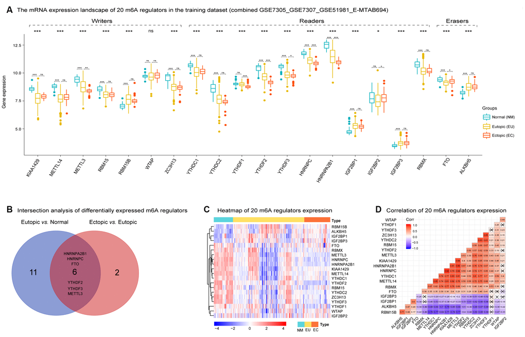 Following pretreatment, the expression levels of 20 m6A regulators were evaluated in samples of NM, EU, and EC tissues by the ‘Kruskal.test’ in the R Package. We also used the R package ‘LIMMA’ to identify differentially expressed m6A regulators in two contrasting matrices: EU vs. NM and EC vs. EU [50] with a threshold of p < 0.05. The differentially expressed m6A regulators that were shared between the EU vs. NM matrix and the EC vs. EU matrix were then screened out by intersection analysis. The expression of these 20 m6A regulators was then demonstrated in a heatmap using ‘pheatmap’ R package; this was based on Euclidean distance and hierarchical clustering [51]. We also evaluated the correlations between these m6A regulators in EMs using Spearman’s correlation analysis with a statistical threshold of p < 0.05.
