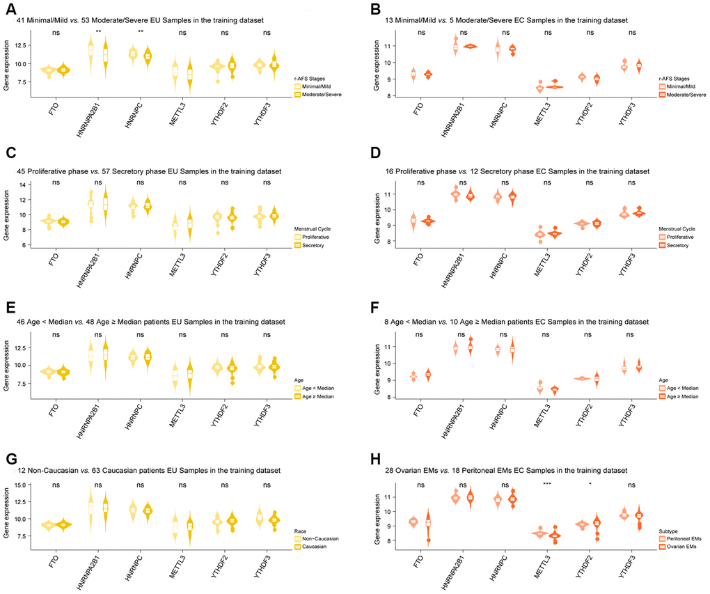The differentially expressed m6A regulators that were shared between the EU vs. NM matrix and the EC vs. EU matrix were then used for clinical correlation analysis. Clinical information is provided in Supplementary Table 1. Using this information, we investigated the associations between the selected m6A regulators and the key clinical features of patients with EMs, including the revised American Fertility Society (r-AFS) stages, menstrual cycle phases, age, races, and disease subtypes (ovarian EMs or peritoneal EMs). This analysis was carried out for both EU and EC samples and involved the ‘Wilcox.test’ in the R package with a statistical threshold of p < 0.05.