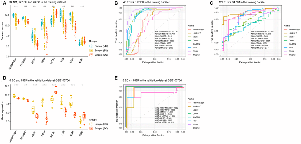 In addition, analysis of the validation dataset (GSE105764) also showed that HNRNPA2B1 and HNRNPC possessed diagnostic potential for discriminating between EC and EU samples, with an AUC of 0.969 and an AUC of 0.938 compared to MKI67 (AUC = 1.000), CDH1 (AUC = 1.000), 1/ACTA2 (AUC = 1.000), PGR (AUC = 0.969), ESR1 (AUC = 1.000) and 1/ESR2 (AUC = 0.828) (Figure 4D, 4E).