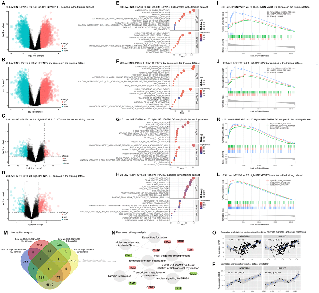 To explore the putative function of HNRNPA2B1 and HNRNPC in EMs, we divided the EU and EC samples into high and low expression groups based on their median expression values. We then identified differentially expressed genes (DEGs) in 63 low-expression vs. 64 high-expression HNRNPA2B1 EU samples, 63 low-expression vs. 64 high-expression HNRNPC EU samples, 23 low-expression vs. 23 high-expression HNRNPA2B1 EC samples, and 23 low-expression vs. 23 high-expression HNRNPC EC samples. Volcano plots showed that the DEGs in EU samples were much more abundant than in the EC samples (Figure 5A–5D). GSEA analysis further indicated that HNRNPA2B1 and HNRNPC were involved in similar Biological Processes (BPs) and Reactome pathways, most of which were associated with immune and inflammatory responses (Figure 5E–5H). For example, in the EU samples, the enriched BP terms and Reactome pathways with the highest normalized enrichment score (NES) in the low-expression vs. high-expression HNRNPA2B1 samples, and the low-expression vs. high-expression HNRNPC samples, were both ‘antimicrobial humoral response’ and ‘initial triggering of complement’ (Figure 5E, 5F). The top 3 BP terms in each matrix were also presented as classical GSEA plots (Figure 5I–5L).