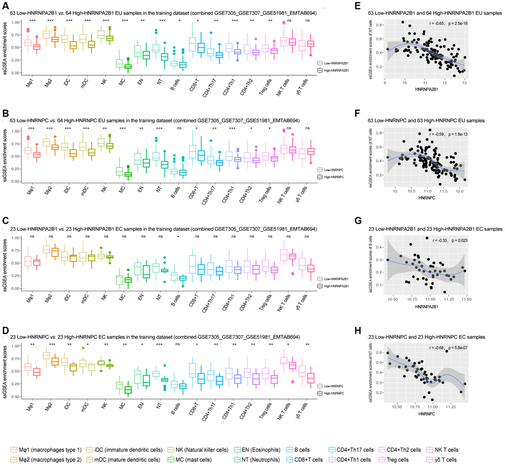ssGSEA analysis indicated that compared with the high-expression HNRNPA2B1 or HNRNPC EU samples, multiple types of immune cells showed significant elevation in the low-expression HNRNPA2B1 or HNRNPC EU samples (Figure 6A, 6B). Similarly, the infiltration scores for immune cells were generally higher in the low-expression HNRNPA2B1 or HNRNPC EC samples compared to the high-expression HNRNPA2B1 or HNRNPC EC samples, although only B cells showed a significant elevation in the low-expression vs. high-expression HNRNPA2B1 EC samples (Figure 6C, 6D). Moreover, the enrichment of immune cells was negatively correlated with the expression of HNRNPA2B1 and HNRNPC in both EU and EC samples (Figure 6E–6H, Supplementary Figure 2).