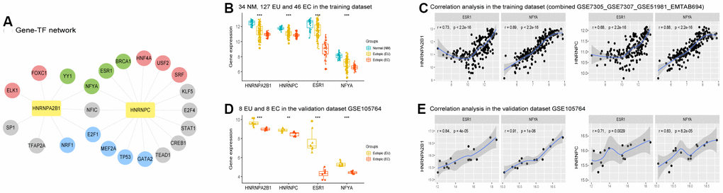 Both HNRNPA2B1 and HNRNPC were significantly and positively correlated with the expression levels of NFYA (one of the common predicted TFs for HNRNPA2B1 and HNRNPC), and ESR1 (one of the putative TFs for HNRNPC), both of which were downregulated in the EU vs. NM and EC vs. EU matrices (Figure 7B, 7C). Similar results were observed in the GSE105764 validation dataset (Figure 7D, 7E and Supplementary Table 4).