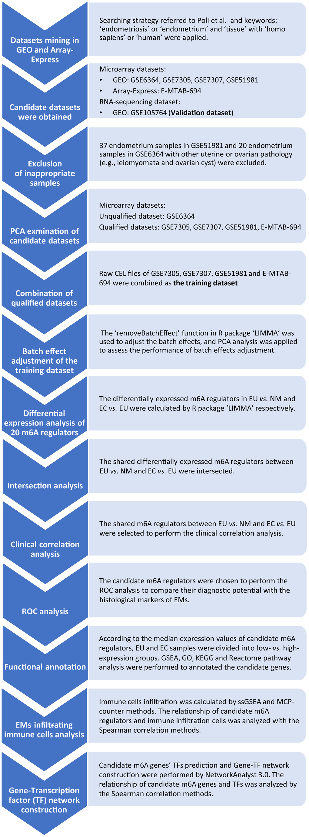 The analysis flowchart is shown in Figure 8. The GEO (https://www.ncbi.nlm.nih.gov/geo/) and Array-Express (https://www.ebi.ac.uk/arrayexpress/) databases were used to mine datasets associated with EMs. The search strategy was previously described by Poli et al. [43] and used the following keywords for the initial screen: ‘endometriosis’ or ‘endometrium’ and ‘tissue’ with ‘homo sapiens’ or ‘human’. Subsequently, we used the ‘platform GPL570’ (Affymetrix Human Genome U133 Plus 2.0 Array) as an additional filter condition to reduce the ‘platform effect’.