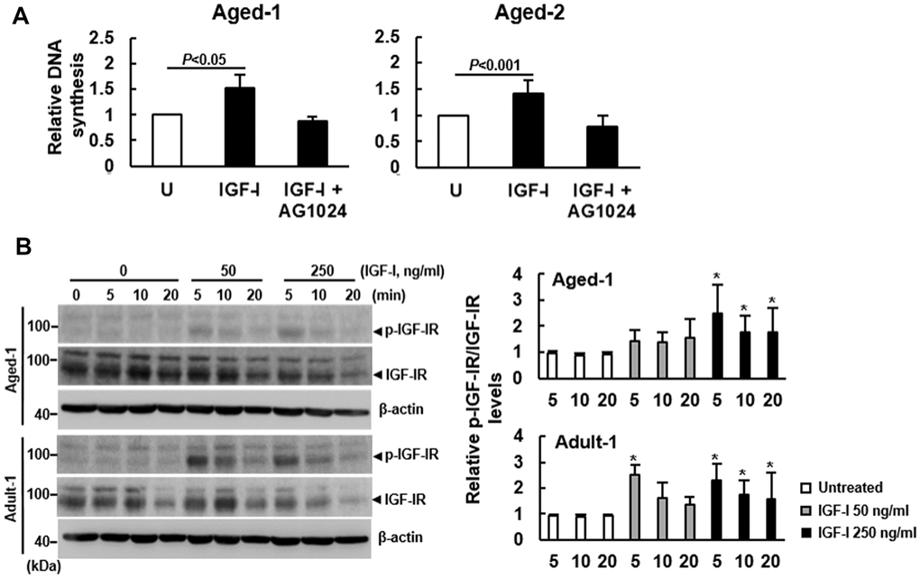 Theoretically, the defect in the transduction of mitogenic signals of a growth factor may originate from the loss of receptors, the compromised ligand-binding and activation of receptors, and the disintegration of the intracellular portion of the signaling cascade. Studies from us and others have found that the expression of IGF-IR and the binding affinity of IGF-I to IGF-IR are not altered by aging (Figure 2 and Supplementary Figure 2) [11, 17]. Notably, AG1024, which inhibits the auto-phosphorylation of IGF-IR and IR with IC50 values around 7 μM and 57 μM, respectively [20], blocked the DNA synthesis as stimulated in the serum-starved aged bmMSCs by high dose of IGF-I (Figure 1) at the dose of 1 μM (Figure 2). These results revealed that high dose of IGF-I stimulates DNA synthesis by stimulating IGF-IR signaling, that the architecture of the intracellular portion of IGF-I signaling cascade may remain integrated in the aged bmMSCs, and most importantly that IGF-IR auto-phosphorylation is the prime target of aging in down-regulating the IGF-I signaling of bmMSCs.