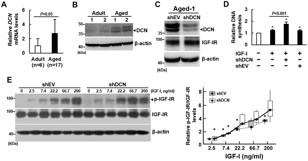 Based on our previous finding that the expression of DCN mRNA in human bmMSCs was increased with advancing age (r=0.57) [5], we examined if DCN played a role in the impairment of IGF-IR activation in response to IGF-I by aging. Consistent with previous findings, RT-qPCR analyses showed that the DCN mRNA levels in bmMSCs from aged donors was approximately 2.7 fold of that in bmMSCs from adult donors (Figure 3A), while the DCN protein levels in Adult-1, Adult-2, Aged-1, and Aged-2 cells also showed that DCN expression increased with aging (Figure 3B). To examine the role of DCN in the IGF-I signaling of bmMSCs, we knocked down DCN expression (approximately 52%) in Aged-1 cells, and examined the IGF-I-induced DNA synthesis. DCN knockdown did not affect IGF-IR expression (Figure 3C). BrdU incorporation assays showed that 200 ng/ml of IGF-I caused approximately 22% (P<0.05), 75% (P<0.05), and 20% (P<0.05) increase in DNA synthesis in the parental, DCN-knockdown (shDCN), and empty-vector control (shEV) Aged-1 cells, respectively (Figure 3D). So, DCN knockdown significantly increased IGF-I-induced DNA synthesis (P<0.001). Consistently, DCN knockdown enhanced IGF-I-induced DNA synthesis in Aged-2 cells (Supplementary Figure 3). Subsequently, we performed dose-response experiments to examine the effects of DCN knockdown on IGF-IR auto-phosphorylation. We treated serum-starved shEV and shDCN cells with or without increasing doses of IGF-I for 5 min, and examined the phosphorylated-IGF-IR-to-IGF-IR ratios (Figure 3E). We used linear regression to analyze the response rates of shEV and shDCN cells. The correlation coefficients between IGF-I concentrations and IGF-IR auto-phosphorylation were 0.4 (P=0.005) for shEV, and 0.7 (P<0.0001) for shDCN, indicating that the IGF-IR auto-phosphorylation in both cells increased significantly in response to increasing IGF-I doses, and that the response rate of shDCN cell was significantly higher than that of shEV cells (Figure 3E). On the other hand, IGF-I seemed not to modulate DCN expression in both groups of cells (Supplementary Figure 4A).