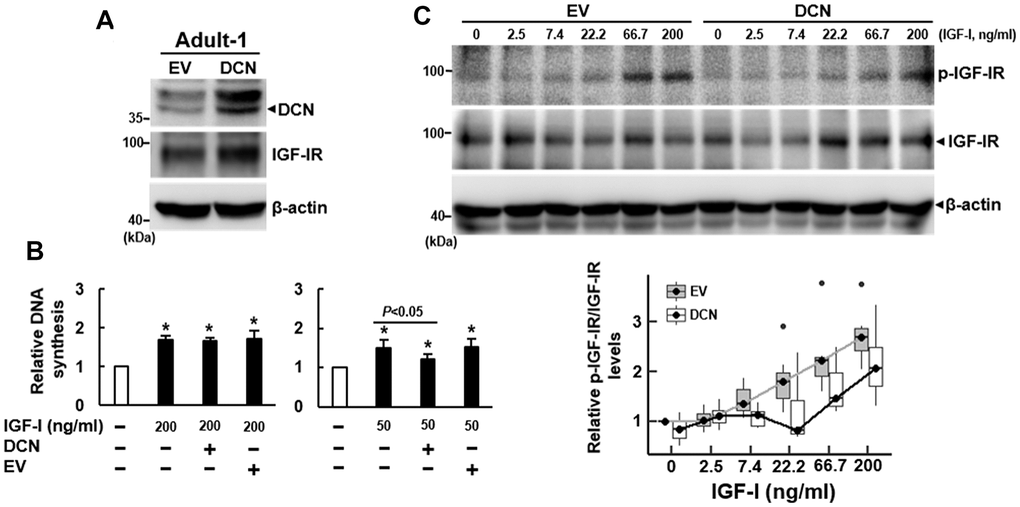 We also overexpressed DCN (approximately 68%) in Adult-1 cells (Figure 4A), and examined the IGF-I-induced DNA synthesis. DCN overexpression seemed not to affect IGF-IR expression (Figure 4A). BrdU incorporation assays showed that 200 ng/ml of IGF-I caused approximately 69% (P<0.05), 66% (P<0.05), and 72% (P<0.05) increase in DNA synthesis in the parental, DCN-overexpressing (DCN), and empty-vector control (EV) Adult-1 cells, respectively, and DCN overexpression seemed not to decrease DNA synthesis (Figure 4B, left). Considering that high dose of IGF-I might counteract the inhibitory effect of DCN overexpression (68%) on DNA synthesis, we decreased IGF-I dose. As a result, 50 ng/ml of IGF-I caused approximately 50% (P<0.05), 21% (P<0.05), and 52% (P<0.05) increase in DNA synthesis in those cells, respectively, and DCN overexpression significantly decreased the IGF-I-induced DNA synthesis (P<0.05) (Figure 4B, right). Consistently, IGF-I (50 ng/ml) induced DNA synthesis in Adult-2 cells, which was decreased by DCN overexpression (Supplementary Figure 3). To examine the rates of IGF-IR auto-phosphorylation of control (EV) and DCN-overexpressing (DCN) Adult-1 cells in response to IGF-I, we treated these serum-starved cells with IGF-I as described for the shEV and shDCN cells (Figure 3E). IGF-I seemed not to modulate DCN expression in both groups of cells (Supplementary Figure 4B). Linear regression analysis revealed no significant difference in the response rates between EV and DCN cells. However, if the data from cells treated with 200 ng/ml IGF-I were excluded from the comparison, the correlation coefficients between IGF-I concentrations and IGF-IR auto-phosphorylation were 0.35 (P<0.0001) for EV cells and -0.17 (P=0.024) for DCN cells. These data indicated that the IGF-IR auto-phosphorylation in both cells increased significantly in response to increasing IGF-I doses, and that the response rate of DCN cell was significantly lower than that of EV cells (Figure 4C). Taken together, our data indicated that DCN acted as an inhibitor of IGF-IR of human bmMSCs.