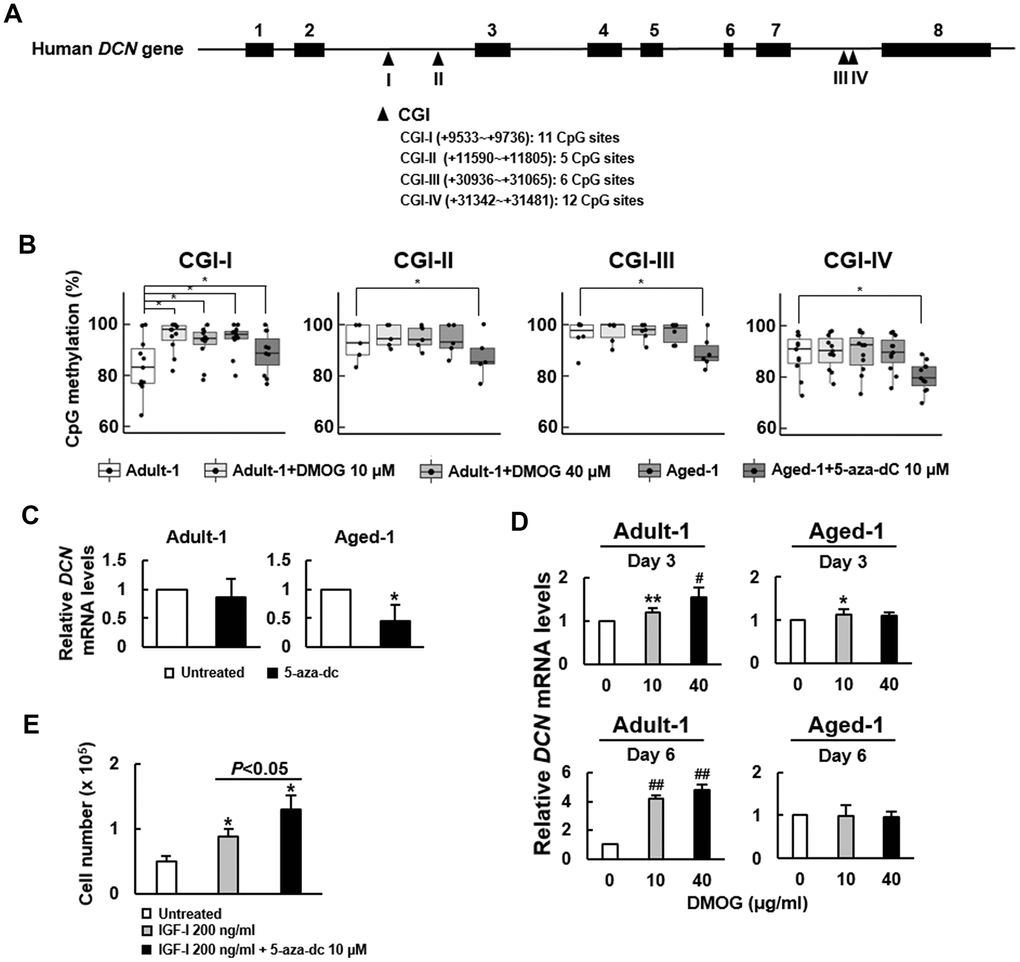 Epigenetic regulation is an important mechanism underlying the gene expression in aging, and has been shown to regulate DCN expression in non-small cell lung cancer cells [19]. To assess if DNA methylation plays a role in regulating DCN expression in bmMSCs, we treated adult and aged rat bmMSCs with or without 5-aza-2’-deoxycytidine (5-aza-dC, a DNA methylation inhibitor) and dimethyloxalylglycine (DMOG, an inhibitor of the ten-eleven translocation proteins (TETs) that cause DNA demethylation) for 3 and 6 days, and then examined Dcn mRNA expression. The results showed that 5-aza-dC (10 μM) decreased Dcn expression in aged bmMSCs, whereas DMOG (10 μM) increased Dcn expression in adult bmMSCs (Supplementary Figure 6). These data suggested a positive association between DNA methylation and Dcn expression. Subsequently, to examine if these results were also seen with human bmMSCs, first, we analyzed the DCN gene sequence using the online MethPrimer for the clusters of cysteine-guanine dinucleotides (CpGs), and located 4 CpG islands (CGIs) in the second and seventh introns, containing 11, 5, 6, and 12 CpG sites, respectively (Figure 6A). We treated Adult-1 and Aged-1 cells with DMOG (10 and 40 μM) and 5-aza-dC (10 μM) for 6 days, respectively, and measured the methylation status of those 34 CpG sites (Supplementary Table 1). We found that the median of methylation of Adult-1 and Aged-1 cells was 83.1% and 96.1%, respectively, in CGI-I; 92.7% and 92.9%, respectively, in CGI-II; 97.7% and 98.6%, respectively, in CGI-III; and 89.2% and 89.1%, respectively, in CGI-IV (Figure 6B). Notably, the DCN methylation of Aged-1 cells was significantly higher than that of Adult-1 cells only in CGI-I (P<0.05). Also, DMOG dose-dependently increased DNA methylation of Adult-1 cells (P<0.05), whereas 5-aza-dC decreased DNA methylation of Aged-1 cells (P<0.05) only in CGI-I. In parallel, both Adult-1 and Aged-1 cells were treated with 10 μM of 5-aza-dC for 6 days. RT-qPCR analyses showed that DCN mRNA expression in Adult-1 cells was not significantly changed (P=0.299), whereas there was approximately 53% decrease in Aged-1 cells (P<0.05) (Figure 6C). Then, both types of cells were treated with 10 μM and 40 μM of DMOG for 3 and 6 days. RT-qPCR analyses showed that DCN mRNA expression in Adult-1 cells was significantly increased with increasing DMOG dose and treatment time, whereas there was no significant change in Aged-1 cells except that 10 μM for 3 days increased DCN expression slightly (Figure 6D). These data suggested a positive association between DNA methylation and DCN expression in human bmMSCs. To examine if inhibition of DNA methylation promoted cell proliferation, we treated serum-starved Aged-1 cells (1 x 105) with or without 10 μM of 5-aza-dC in the presence of IGF-I for 6 days, and compared their cell number with that of the control. The cell number of the control, IGF-I treated, and IGF-I plus 5-aza-dC-treated groups was 5 x 104, 8.9 x 104, and 1.3 x 105, respectively (Figure 6E). These data suggested that IGF-I plus 5-aza-dC increased cell proliferation (Figure 6E).
