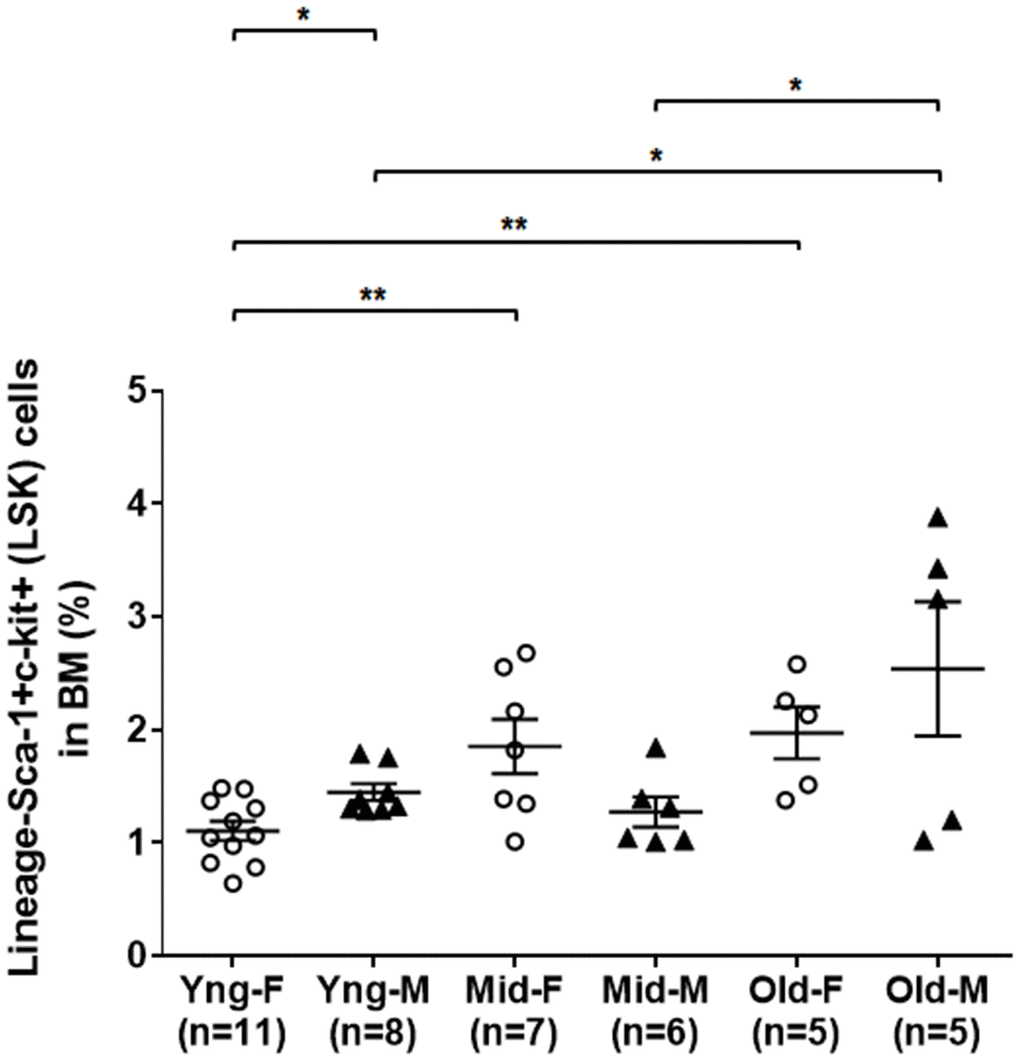 As shown in Figure 1, flow cytometry analysis indicated that the percentages of LSK cells in the BM of middle-aged female (Mid-F) and old female (Old-F) mice were significantly higher than that of young female (Yng-F) mice. The percentages of LSK cells were comparable between Mid-F and Old-F mice. However, the percentages of LSK cells were comparable between young male (Yng-M) and middle-aged male (Mid-M) mice. The percentage of LSK cells in old male mice (Old-M) was significantly higher than that of Yng-M or Mid-M mice. Interestingly, Yng-M mice appeared to have higher percentage of LSK cells in the BM than Yng-F. Thus, the number of HSPCs increases significantly from young age to middle age in female mice, whereas the number of HSPCs increases significantly from middle age to old age in male mice.