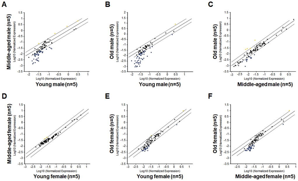 Table 4. Significantly higher levels of relative gene expression in LSK cells of middle-aged female than middle-aged male mice.