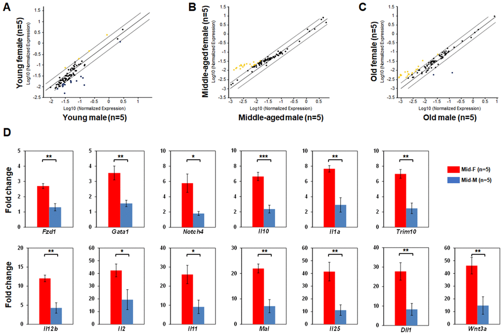 Next, we compared the LSK hematopoietic gene expression profiles between age-matched male and female mice. The LSK cells of Yng-F and Yng-M mice showed a comparable expression profile except for a few transcripts with a non-significant trend toward reduced expression in Yng-F (Figure 3A). However, a considerable number of hematopoietic genes in the LSK cells of Mid-F mice exhibited significantly higher expression than those in Mid-M mice (Figure 3B, Table 4). It is worth noting that all genes identified in Table 4, which had a higher expression level in Mid-F than Mid-M mice, were also identified in Table 1 as down-regulated genes in Mid-M compared with Yng-M mice. The LSK cells of Old-F and Old-M mice showed a mostly comparable expression profile except for several genes with a non-significant trend toward higher expression in Old-F than Old-M mice (Figure 3C). Using real time PCR, we could confirm in individual genes the higher gene expression levels in Mid-F than Mid-M mice (Figure 3D). Thus, our results indicate a delayed decline in hematopoietic gene expression in female compared with male HSPCs during aging.