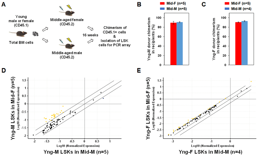 In order to determine whether the middle-aged female BM microenvironment plays a role in sustaining hematopoietic gene expression during aging, we performed sex-mismatched heterochronic BM transplantations in mice. C57BL/6 mice with CD45.2 allele were used as recipients and injected with whole BM cells from congenic mice with CD45.1 allele so that donor or recipient cells can be readily identified by their CD45 allotypes. As illustrated in Figure 4A, whole BM cells from CD45.1 Yng-M or Yng-F mice were transplanted into lethally irradiated CD45.2 Mid-F or Mid-M mice. After 16 weeks, Yng-M CD45.1+ donor cell chimerism in both Mid-F and Mid-M recipients were ≥ 90% (Figure 4B). Similar results were obtained with Yng-F CD45.1+ donor cell chimerism in both Mid-F and Mid-M recipients (Figure 4C). Given the comparable chimerisms in the recipient mice, we then isolated the donor-derived LSK cells from the transplant recipients and performed a hematopoietic gene expression profiling on these cells. As shown in Figure 4D and Table 5, a considerable number of hematopoietic genes in the Yng-M-derived LSK cells isolated from the Mid-F recipients exhibited significantly higher expression than from the Mid-M recipients. Similarly, a number of hematopoietic genes in the Yng-F-derived LSK cells isolated from the Mid-F recipients exhibited significantly higher expression than from the Mid-M recipients (Figure 4E, Table 6). Combined, these results demonstrate that the middle-aged female BM microenvironment plays a pivotal role in sustaining hematopoietic gene expression during aging.