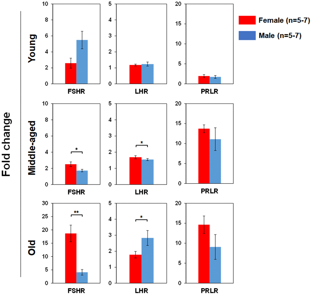 Peripheral blood samples of 100 μl were collected from the retro-orbital sinus of young, middle-aged, and old male and female mice. Blood was allowed to clot for 20 min at room temperature. The supernatants were collected after centrifugation, and 10 μl serum were used for each sample. FSH, estrogen and androgen levels in each serum sample were determined by using ELISA kits (Mybiosource, San Diego, CA) according to manufacturer’s instructions. The plates were read using a Spectra Max 190 microplate reader (Molecular Devices, Sunnyvale, CA) at 450 nm wavelength. Sex hormone concentration in serum was determined as mIU/ml for FSH, pg/ml for estrogen and ng/ml for androgen.