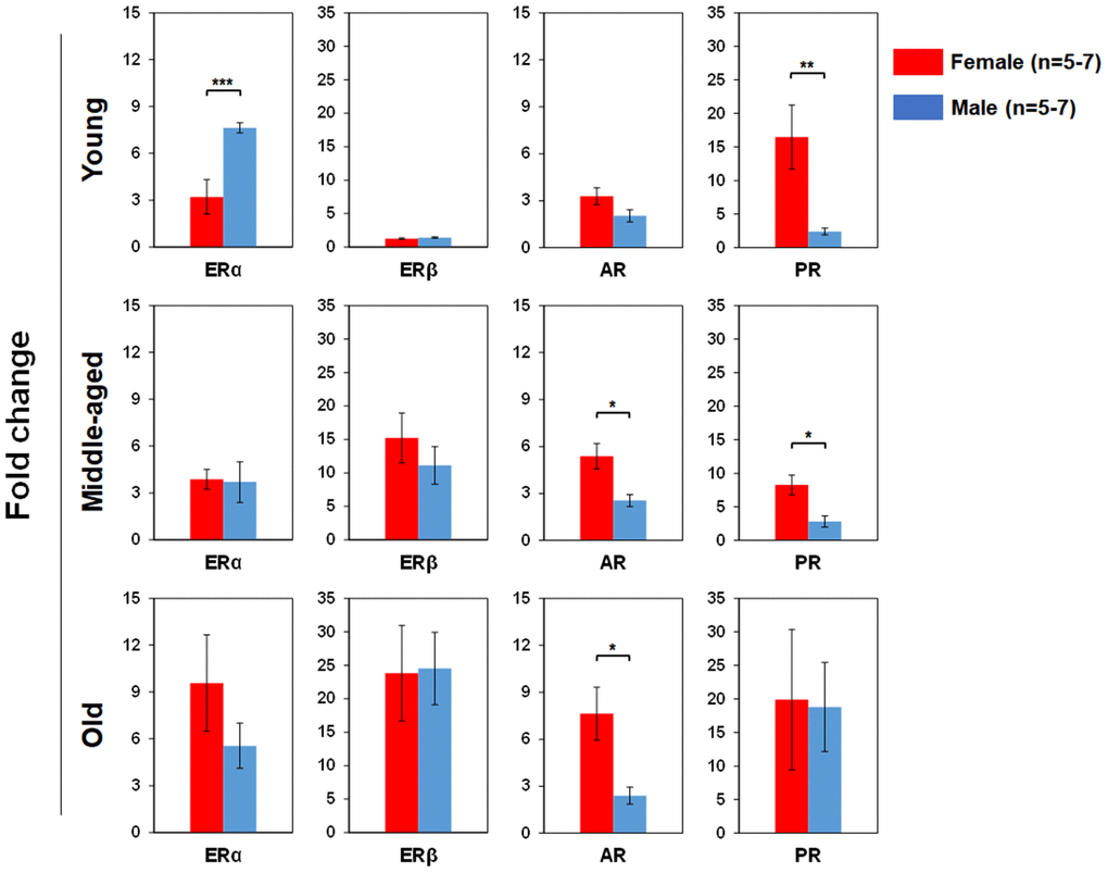 We used real time RT-PCR to determine pituitary SexHR gene expression in BM-derived LSK cells isolated from both male and female mice of different age groups (Figure 5). We found significantly higher FSHR gene expression in the LSK cells from middle-aged and old female than age-matched male mice. LHR gene expression in the LSK cells was higher in middle-age female than male, but higher in old male than female mice. PRLR gene expression in the LSK cells had no differences between male and female mice in all age groups. We also determined gonadal SexHR gene expression in BM-derived LSK cells isolated from both male and female mice of different age groups (Figure 6). We found significantly higher ERα expression in LSK cells of Yng-M mice than Yng-F mice but no differences in other age groups. ERβ expression levels in LSK cells were comparable between male and female mice in all age groups. Interestingly, we also found significantly higher AR gene expression in the LSK cells from middle-aged and old female mice than age-matched male mice. Finally, PR gene expression was significantly higher in both Yng-F and Mid-F than the age-matched male LSK cells, and was comparable between LSK cells from Old-F and Old-M mice.