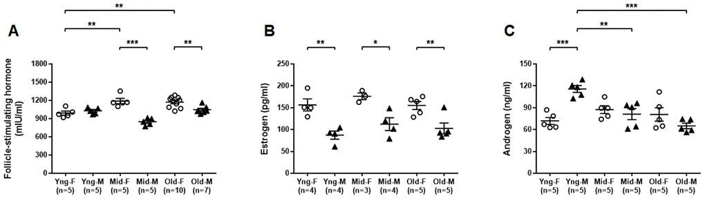 We used ELISA assays to determine the concentrations of select sex hormones in peripheral blood from both male and female mice of all age groups. Serum FSH concentrations were significantly higher in Mid-F and Old-F mice than Yng-F mice. Serum FSH concentrations were also significantly higher in Mid-F and Old-F mice than age-matched male mice (Figure 7A). Serum estrogen levels were significantly higher in female than age-matched male mice of all age groups (Figure 7B). Serum androgen levels were significantly higher in Yng-M mice than those in Yng-F mice. Serum androgen levels were also significantly higher in Yng-M mice than those in Mid-M or Old-M mice (Figure 7C). Androgen levels were comparable in middle-aged and old mice of both sexes.