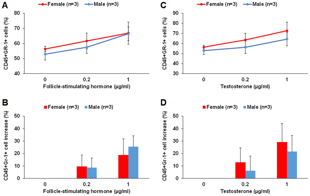 By culturing middle-aged male and female LSK cells in the MethoCult GF M3434 methylcellulose medium in the presence of FSH or testosterone, we found that FSH and testosterone could each promote myeloid differentiation of LSK cells in vitro. FSH at 0.2 and 1 μg/ml concentrations increased the number of CD45+Gr-1+ myeloid cells by about 8-10% and 20-25%, respectively, for both male and female LSK cells (Figure 8A and 8B). Testosterone at 0.2 and 1 μg/ml concentrations increased the number of CD45+Gr-1+ myeloid cells by about 15% and 30% in female, respectively; about 5% and 20% in male LSK cells (Figure 8C and 8D). There were no differences in CD45+B220+ cells in any of the conditions tested. It is worth noting that despite of our optimization much of the proliferation and differentiation of the LSK cells were already driven by the existing growth factors in the MethoCult GF M3434 methylcellulose medium.