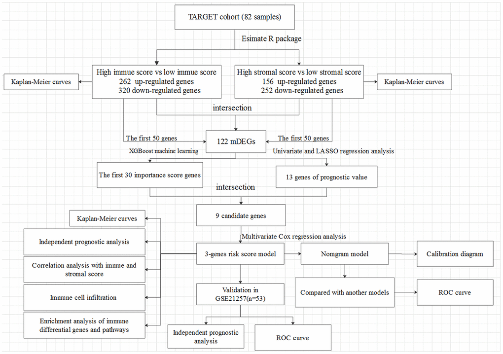 In this study, 82 OSs patients (≤ 25 years of age) from TARGET were enrolled, those with complete gene expression data of samples and clinical information of follow-up. The detailed clinical characteristics of patients were summarized in Supplementary Table 1. The flowchart of the analysis procedure was shown in Figure 1. Based on the normalized matrix data, the TME score was graded using the Estimate algorithm, and the results showed that the immune scores and stromal scores of all patients were ranged from -1508.04 to 2638.38 and from -695.66 to 1962.14, respectively.