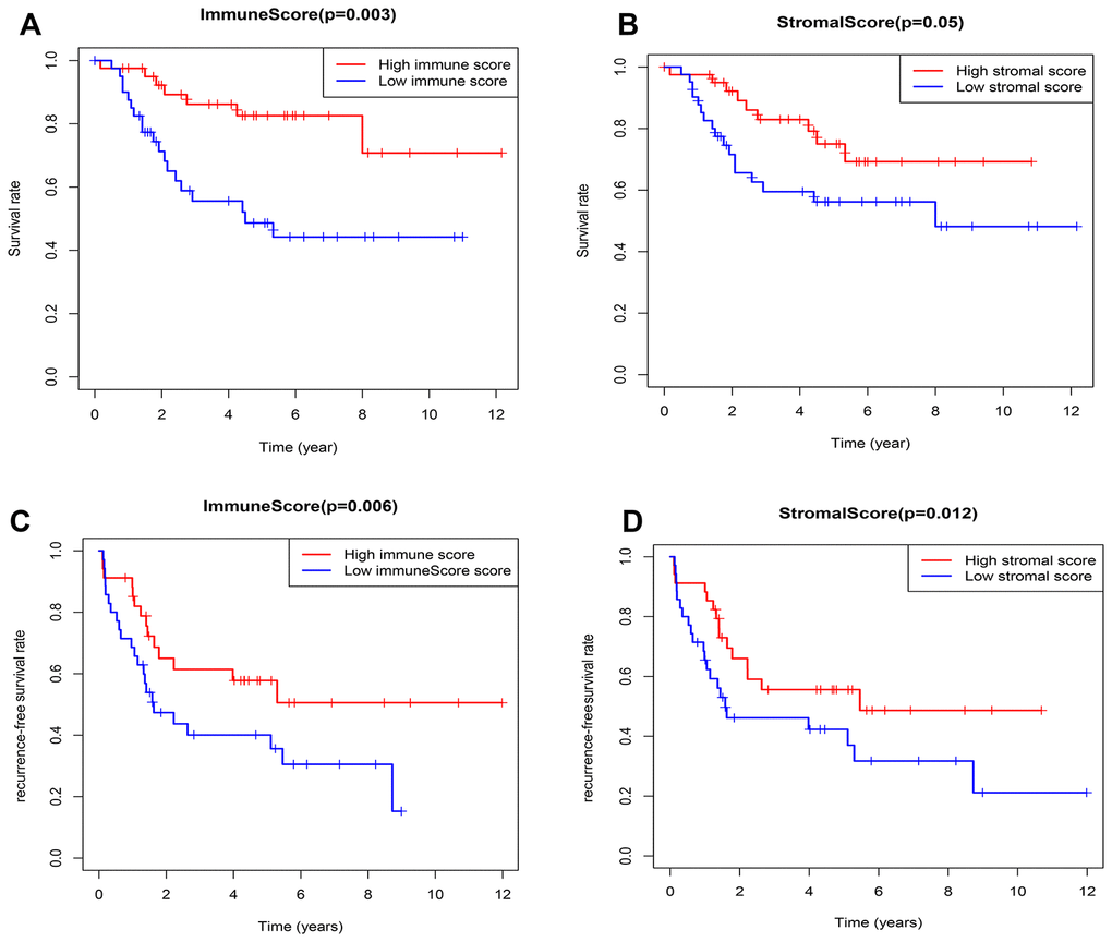 According to the median value of immune/stromal score, 82 OSs patients were divided into high and low score group. Kaplan-Meier (K-M) curves showed that the 5-year overall survival (OS) rates of patients with high and low immune scores were 82.6% and 48.7%, respectively (P=0.003) (Figure 2A). As well as, the 5-year recurrence-free survival (RFS) rates were 65% and 47.3%, respectively (P=0.006) (Figure 2C). Consistently, the 5-year OS rates of patients with high and low stromal scores were 65% and 47.3%, respectively, the P value approximately reached statistical difference (P=0.053) (Figure 2B), and the 5-year RFS rates were 66% and 46.1%, respectively (P=0.012) (Figure 2D), indicating that the TME-related immune and stromal score in the TME were significantly correlated with the survival.