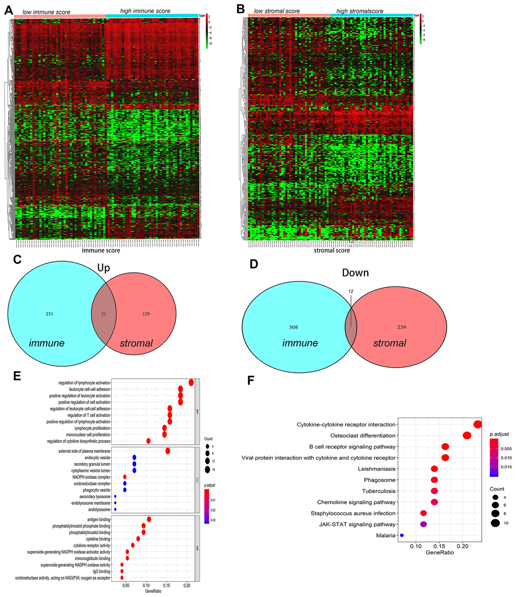 The DEGs between the high and low immune/stromal scores groups were obtained based on gene expression profiles, and a fold-change > 1 or < -1 and adjusted P<0.05 were used as criterions for screening DEGs. Heatmaps showed the distinct gene expression profiles from the two groups in Figure 3A, 3B. In the high immune score group, 320 genes were down-regulated and 262 genes were up-regulated (Supplementary Tables 2A, 2B). Meanwhile, the high stromal score group had 252 genes down-regulated and 160 genes up-regulated (Supplementary Tables 3A, 3B). Furthermore, Venn diagram was used to find the common-DEGs in the two groups (Figure 3C, 3D), showing that 31 genes were generally up-regulated and 12 genes were markedly down-regulated (Supplementary Table 4). The top 50 genes with the most significant difference between the high and low immune score groups, and the high and low stromal score groups, respectively, and other differentially expressed genes crossing with Venn diagram were all included. Finally, a total of 122 genes, defined as the TME-related differentially expressed genes (tmDEGs), were included in the subsequent functional classification analysis.