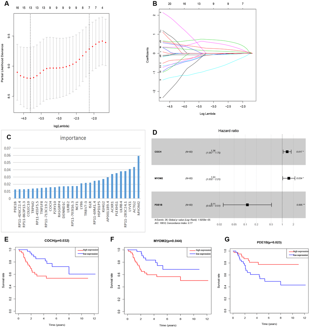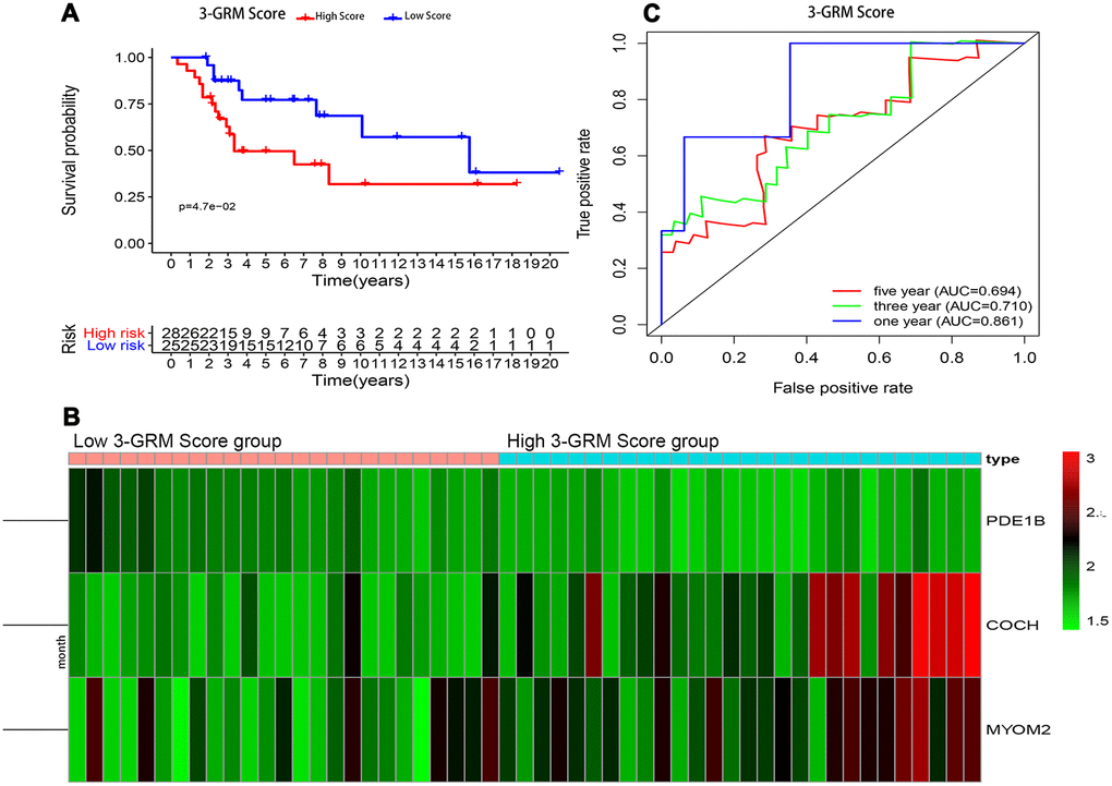 The genes related to survival of OSs patients were screened by univariate cox and lasso regression, and Xgboost was used to further narrow the screening range, then multivariate cox regression analysis was used to determine the genes used to establish the prognosis model. The Lasso regression was analyzed using "glmnet" R software package. XGBoost machine learning [71], used Anaconda software, and its script was from MichaelMW (github.com/MichaelMW/bnfo.course). The formula of risk scoring was as follows: risk score= [0.30×COCH expression level]+[0.41×MYOM2 expression level]-[2.1×PDE1B expression level]. In this paper, the evaluation of the 3-GRM involved ROC curve. “Survival ROC” R software package was used to visualize the specificity and sensitivity of the 3-GRM.