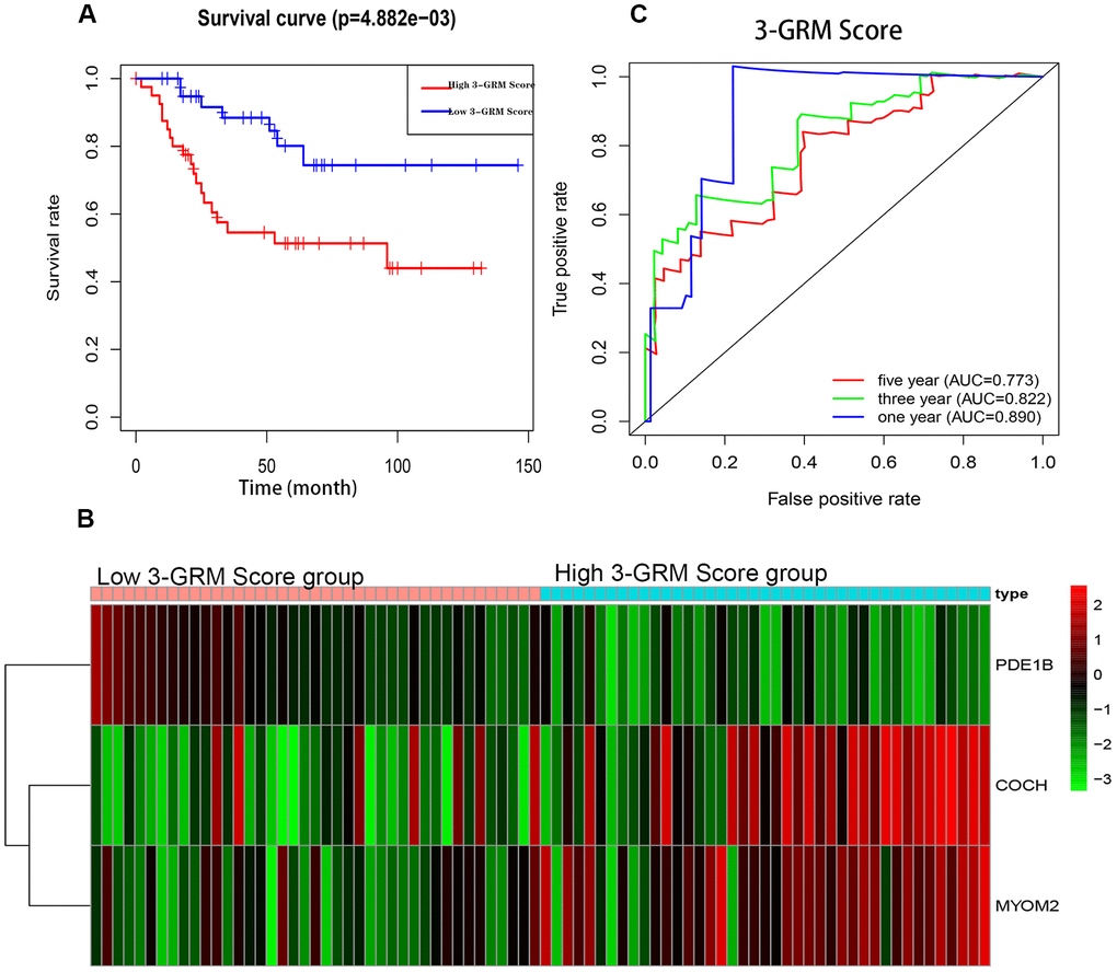 The K-M analysis showed that the OS of high 3-GRM score group was significantly lower than that of low score group (P<0.05) (Figure 5A), and the 5-year survival rates of the high and low score group were 51.3% and 80.1%, respectively (P=0.000). The distribution of genes expression data in the subgroup of difference risk scores were shown in Figure 5B. The prediction ability of 3-GRM was evaluated by calculating the area under the ROC curve (AUC). The AUC values in predicting 1, 3 and 5-year of survival rate were 0.890, 0.822 and 0.773, respectively, indicating that 3-GRM had a good prediction effect (Figure 5C).