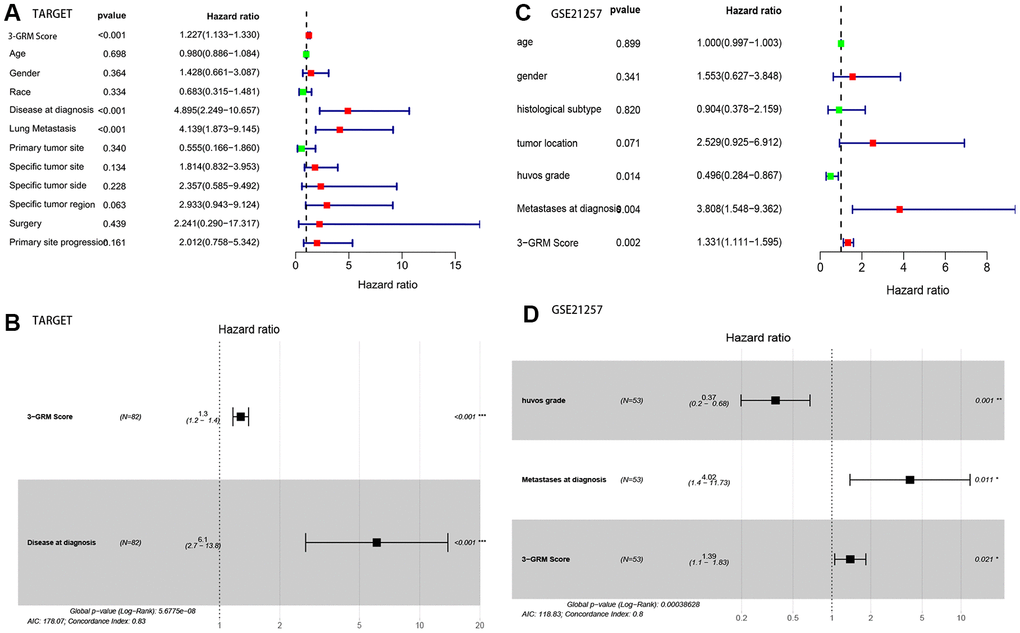 Based on the clinical data and survival information of 82 patients, univariate cox regression analysis showed that the high score of 3-GRM, metastasis at diagnosis and lung metastasis were the risk factors affecting prognosis, but age, gender, race, primary site, specific site of primary tumor, and surgical method were not related to outcome of patients (Figure 6A). As in the TARGET database (as above), 95% of patients (20/21) with metastasis at diagnosis had lung metastasis, so these two factors were classified as having metastasis at diagnosis for further analysis. Multivariate cox regression analysis confirmed that high 3-GRM score and metastasis at diagnosis were independent risk factors of OSs patients (Figure 6B). K-M analysis showed that the 5-year survival rates of cases with metastases and without metastases at diagnosis were 31.3% and 77.4%, respectively (P<0.001, data not shown).