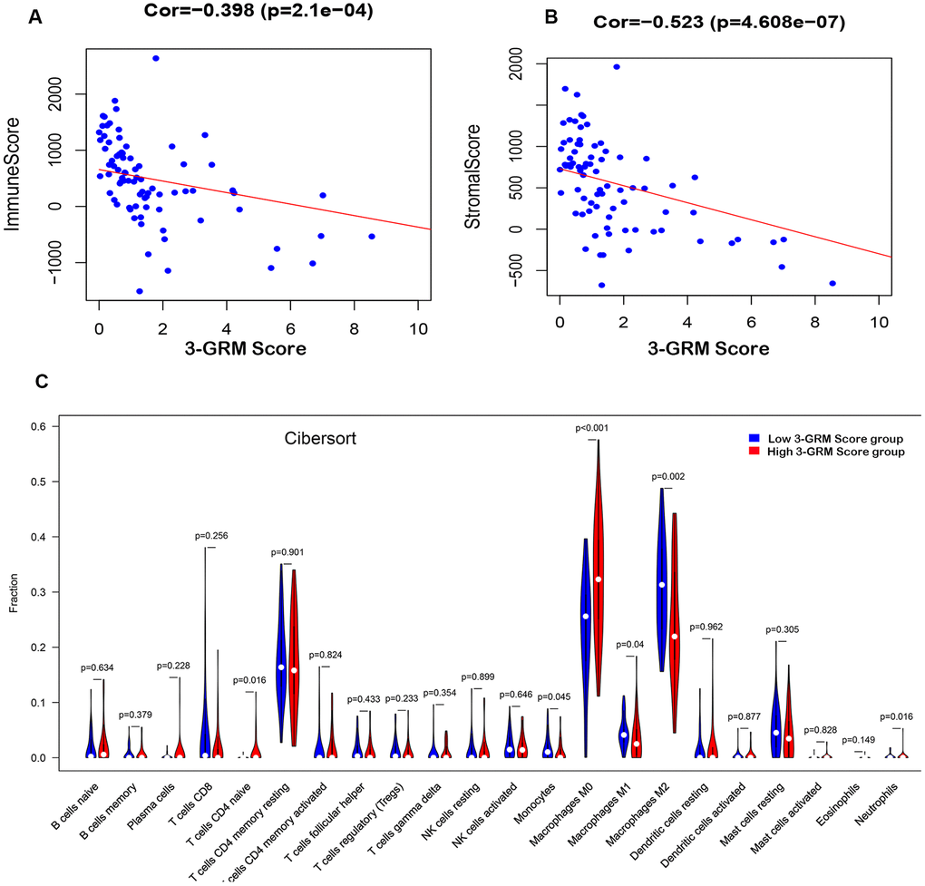 Based on TARGET database, the analysis results found that the 3-GRM score was both significantly correlated with the TME-related immunity score (R=0.398, P<0.01) and the stromal score (R=0.523, P<0.01) (Figure 8A, 8B), respectively, indicating that the higher the 3-GRM score, the lower the immune score and stromal score.